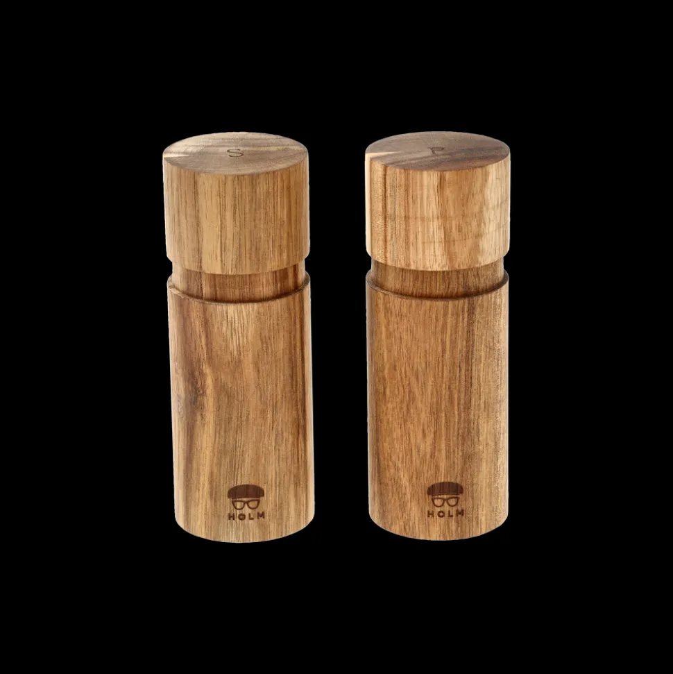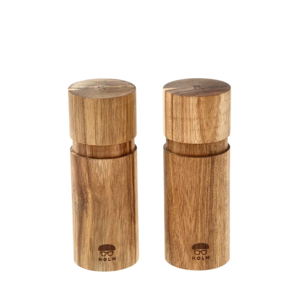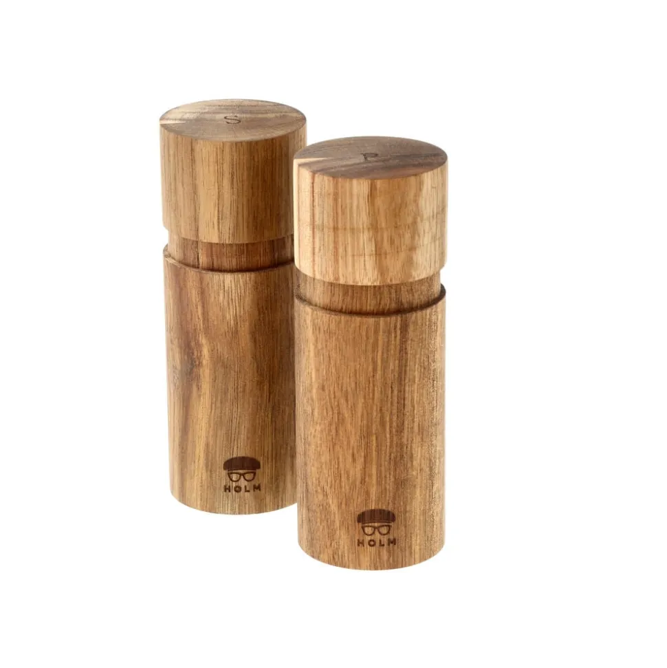 Flot salt- og peberkværnsæt i akacietræ med keramisk kværnindsats. Kværnene har et maskulint udtryk, og deres indhold af salt og peber er markeret med et diskret S eller P på toppens. Du kan selv bestemme, hvor groft eller fint du ønsker at kværne. Malingsgraden justeres nemt i bunden af kværnen.