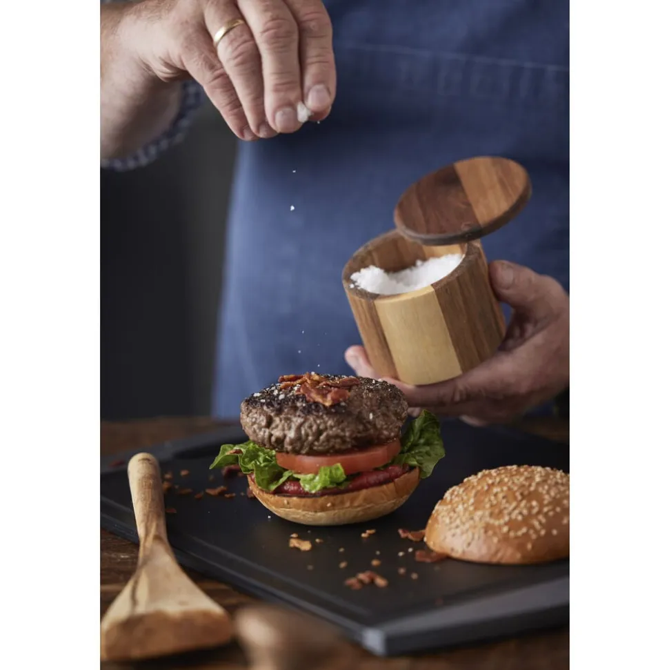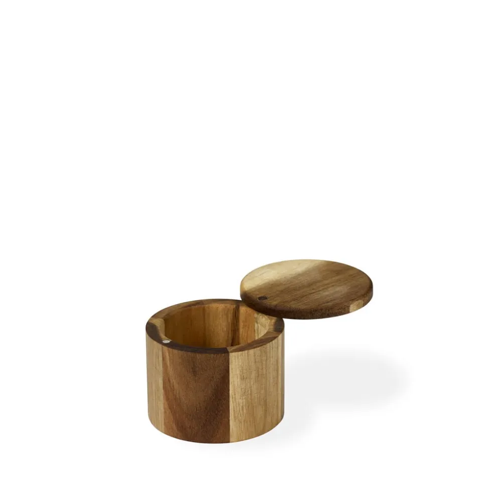 Saltkar med et rum og magnetlåg i akacietræ. Sættes aldrig i blød og rengøres med varmt vand og mild sæbe. Saltkarrets yderside kan med fordel efterbehandles med madolie et par gange om året. Salt og saltske medfølger ikke. Tåler ikke opvaskemaskine.