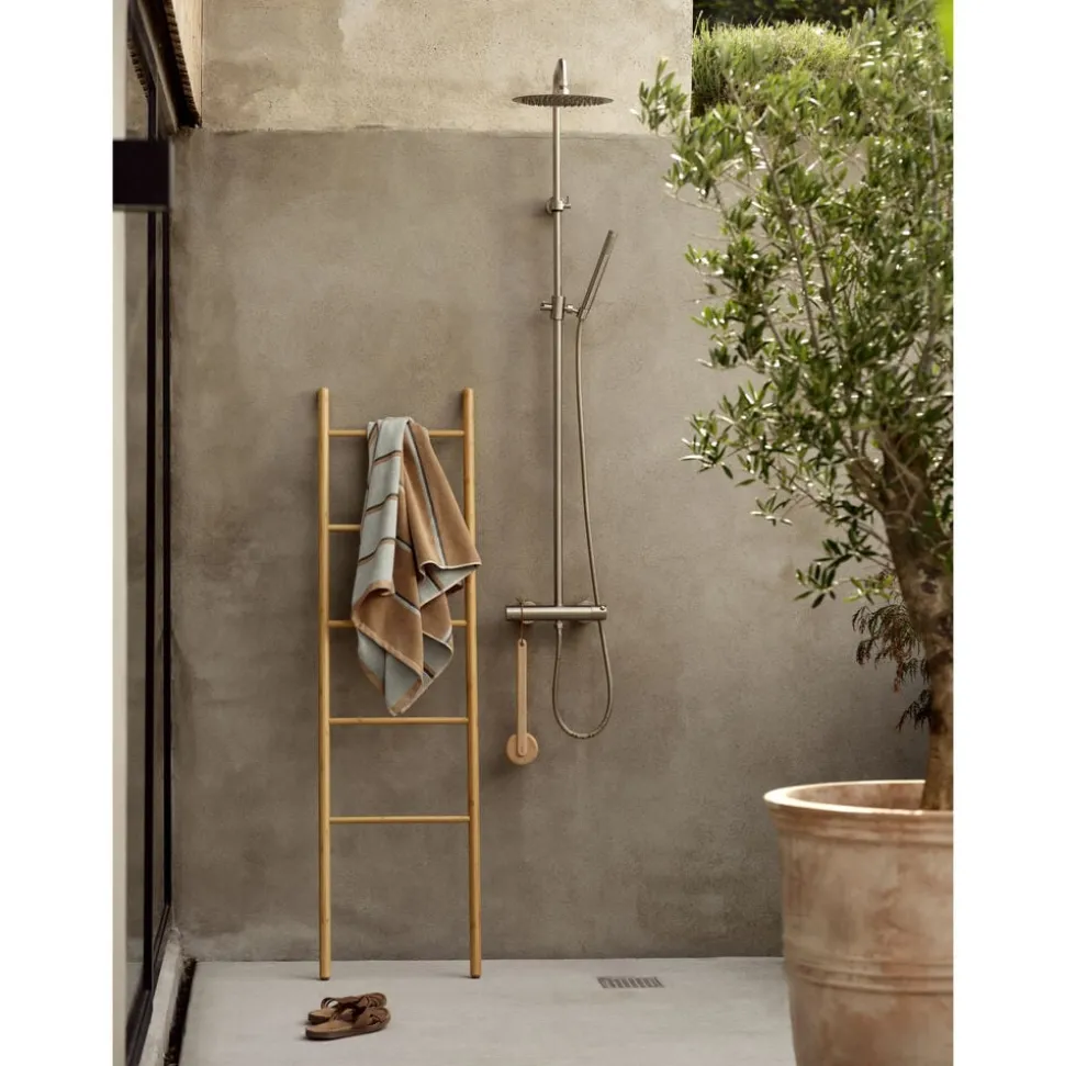 De retroinspirerede striber tilføjer et grafisk, urbant touch, og med en blød, kraftig kvalitet i garnfarvet 600 grams bomuld, føles håndklædet lige så lækkert, som det ser ud.