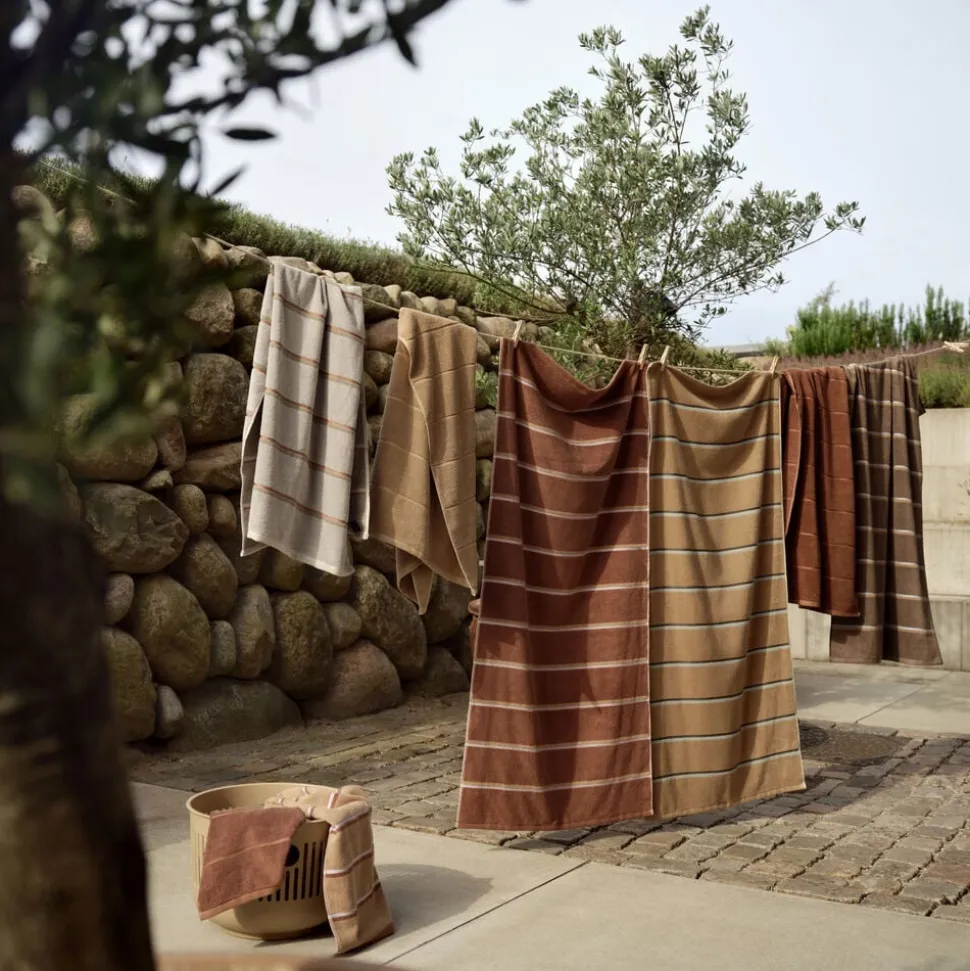 Sauna er navnet – og striberne taler for sig selv. Serien er inspireret af de stramme linjer i en klassisk træbeklædt sauna, hvor designet leger elegant med perspektiv og farvebalance. Hver side af håndklædet fremhæver sin egen dominerende farve – en fin detalje, der giver dig to forskellige udtryk i ét og samme håndklæde