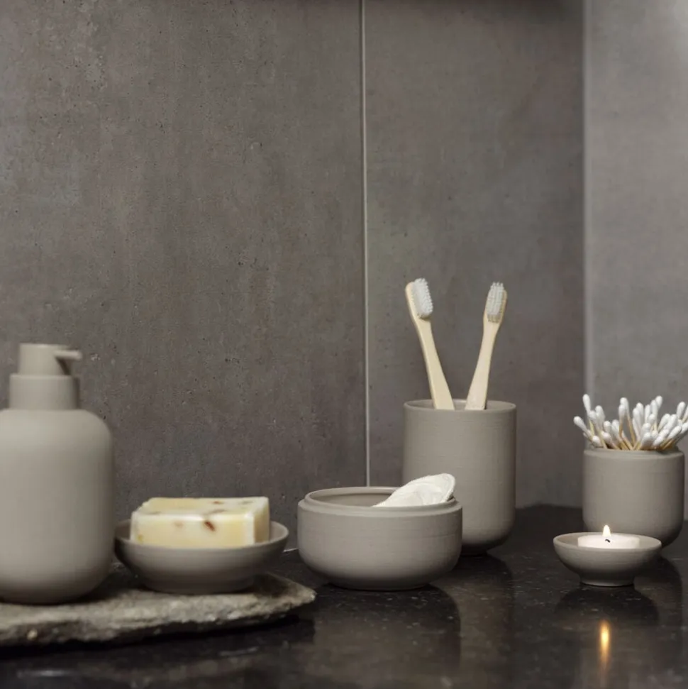 Ved vasken finder du en sød cylinderformet sæbedispenser med et fint lille pumpehoved. Den matcher det klassiske tandbørstekrus, der, ligesom seriens øvrige designs, er udført i stentøj. Takket være stentøjets tyngde og den runde bund står tandbørstekruset sikkert på bordet. Køb evt. flere og brug et af dem til make-up-børster, barbergrej eller andre hverdagsfavoritter, der skal være inden for rækkevidde.
