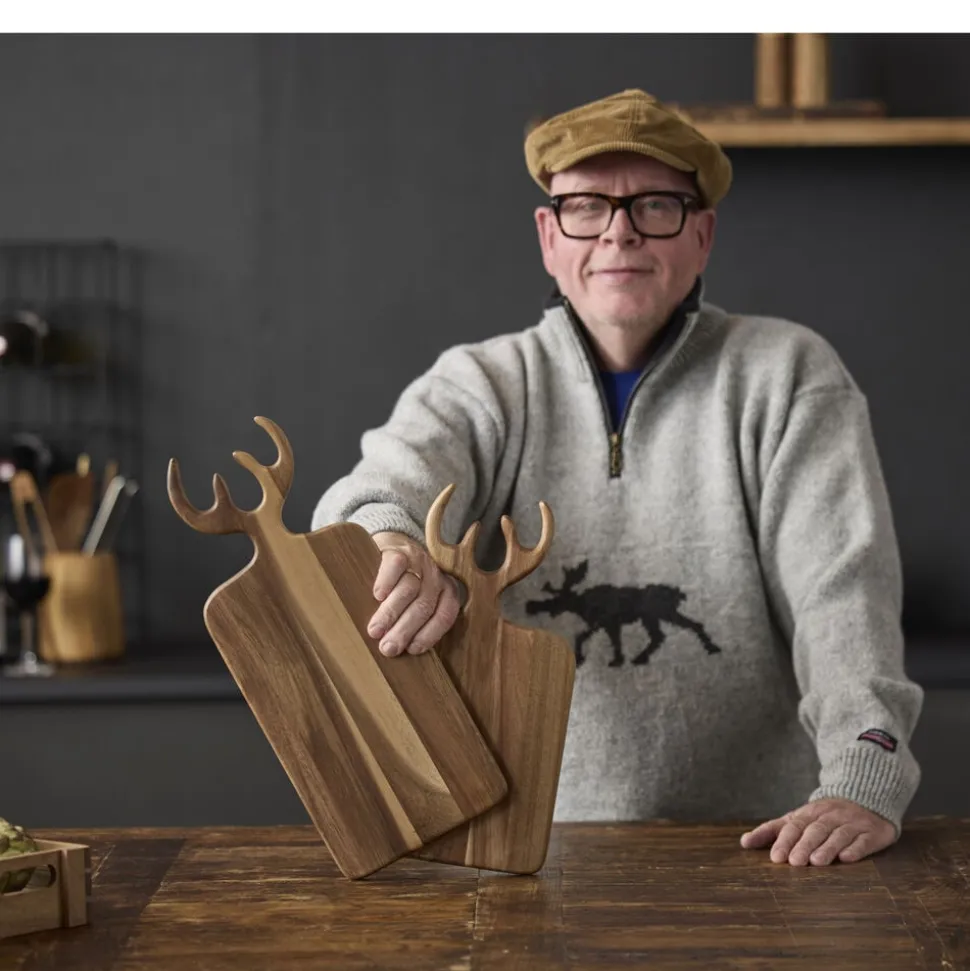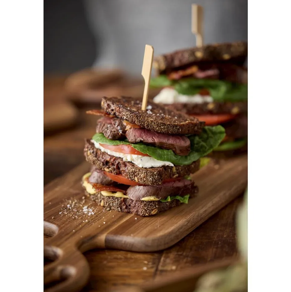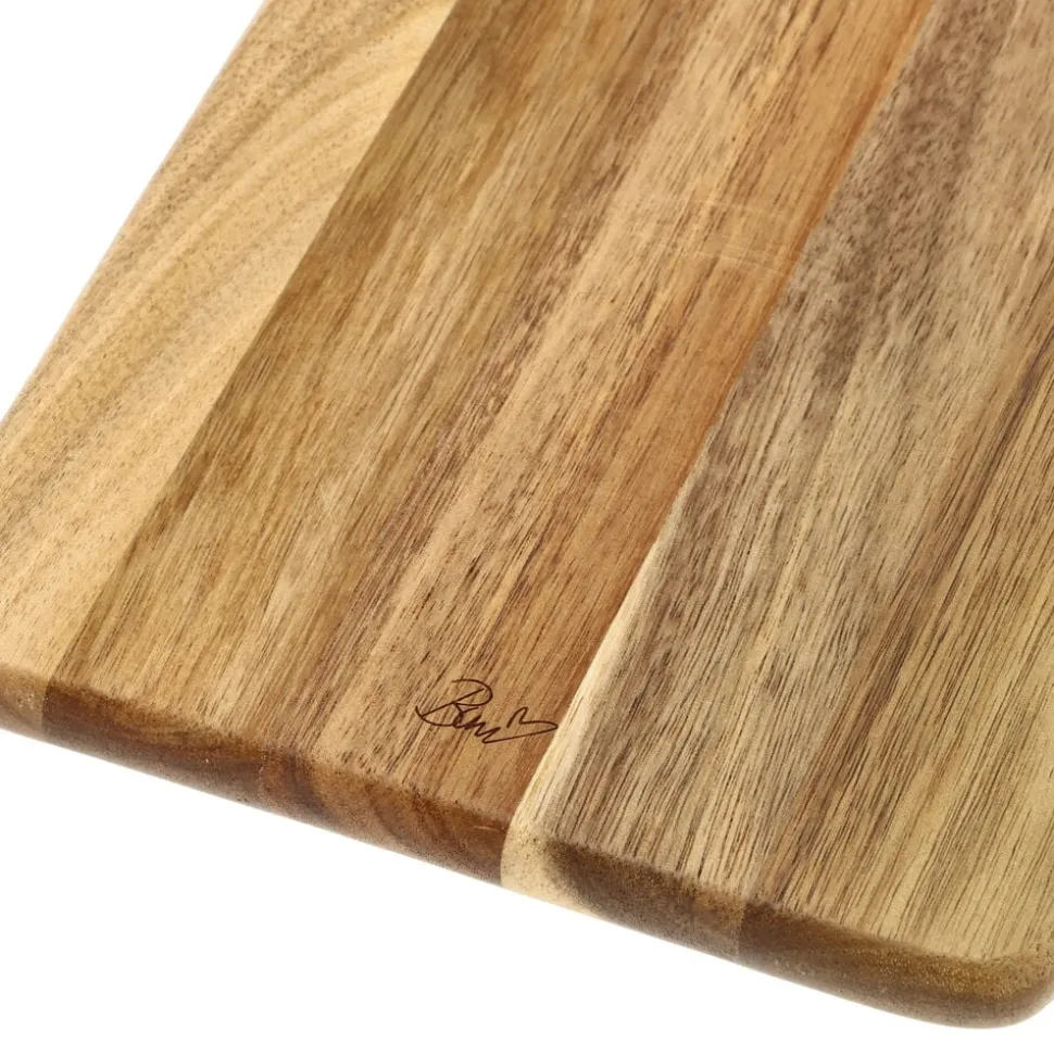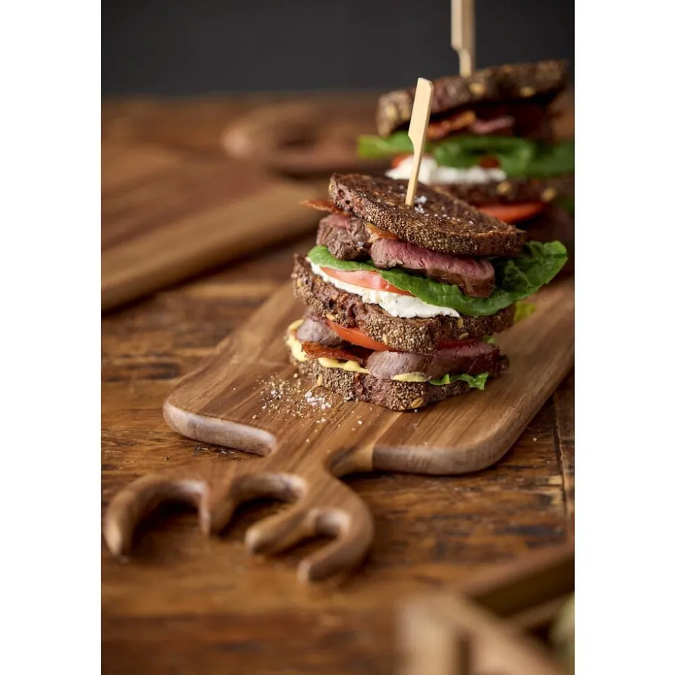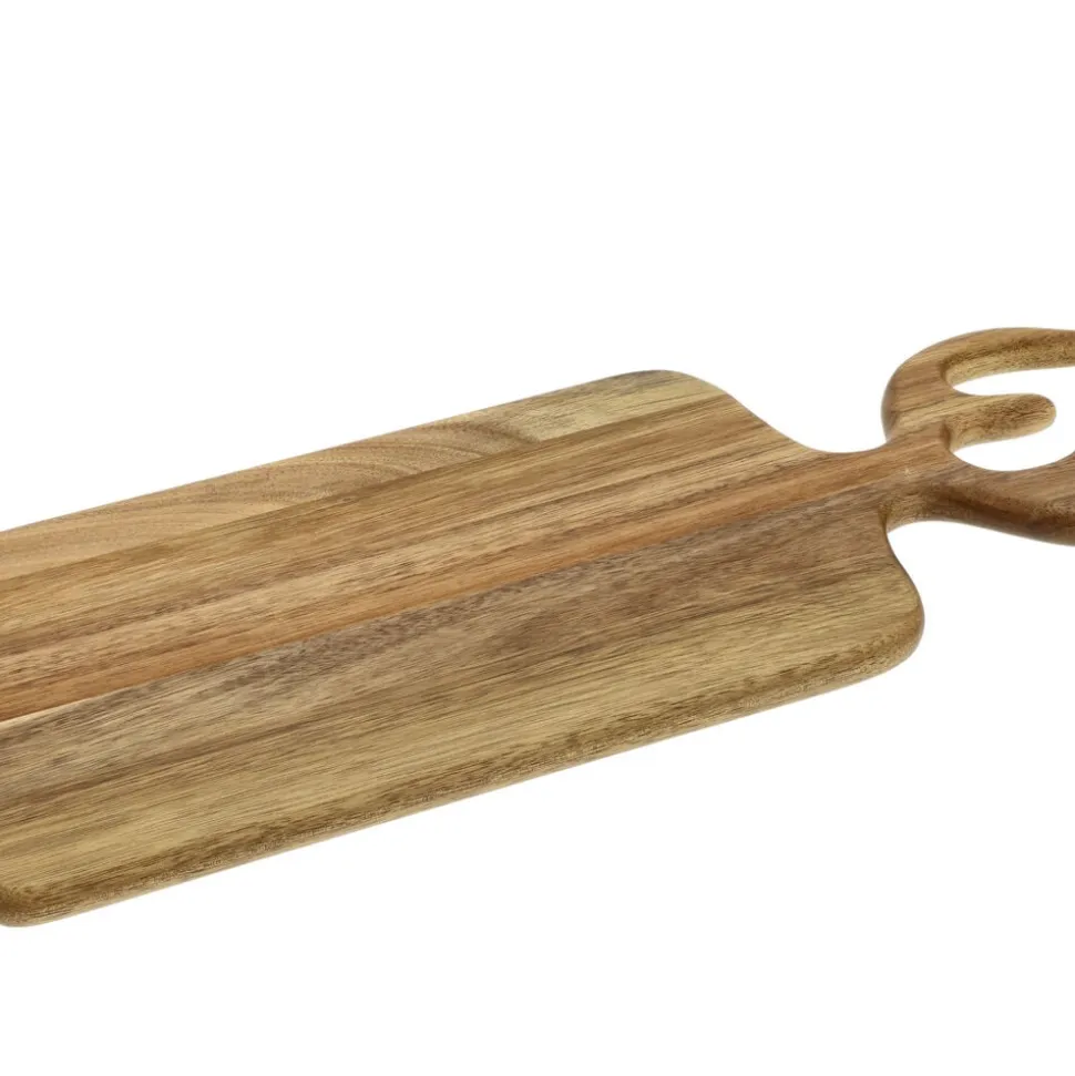 Serveringsbræt i smukt akacietræ. Geviret er et rustikt, elegant og praktisk håndtag på serveringsbrættet. Brættet er ideelt til servering af ost, tapasretter og andre anretninger eller som skærebræt under tilberedning af måltidet. Læg aldrig brættet i blød. Vaskes med varmt vand og mild sæbe. Tåler ikke opvaskemaskine. 44 x 18 x 1,5 cm.