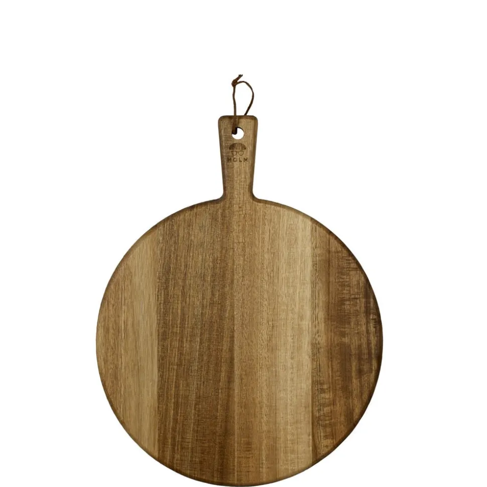 Rundt serveringsbræt i akacietræ. Kan bruges til servering af pizza, antipasti-retter og anden slags pålæg. Læg aldrig dit serveringsbræt i blød. Vaskes med varmt vand og mild sæbe. Brættet kan med fordel efterbehandles med madolie et par gange om året. Tåler ikke maskinopvask.