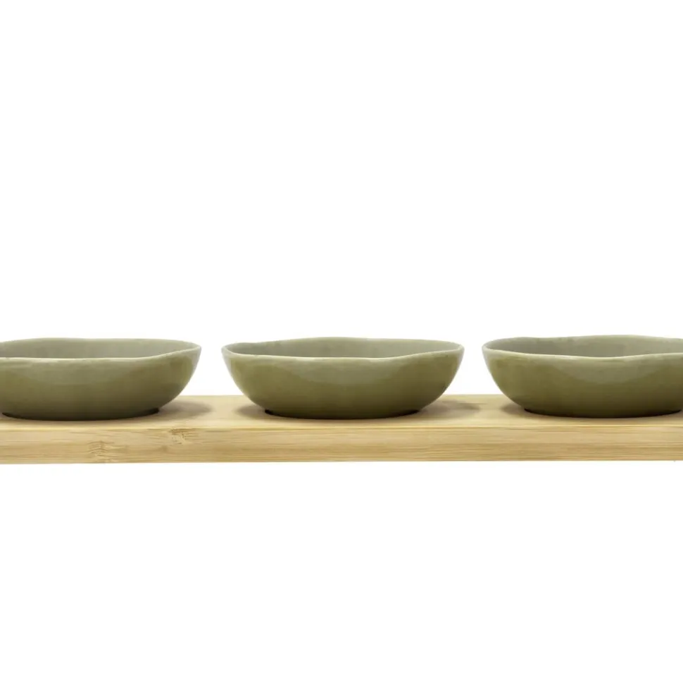 Denne bambusbakke med tre skåle er perfekt til servering af snacks, dips eller små forretter. Materialerne bambus og stentøj kombineret med Shoku-designets enkle linjer gør den ideel til både daglig brug og særlige lejligheder. Skålene er egnede til mikroovn og ovn op til 220 grader og kan vaskes i opvaskemaskine, mens bambusbakken skal vaskes i hånden.