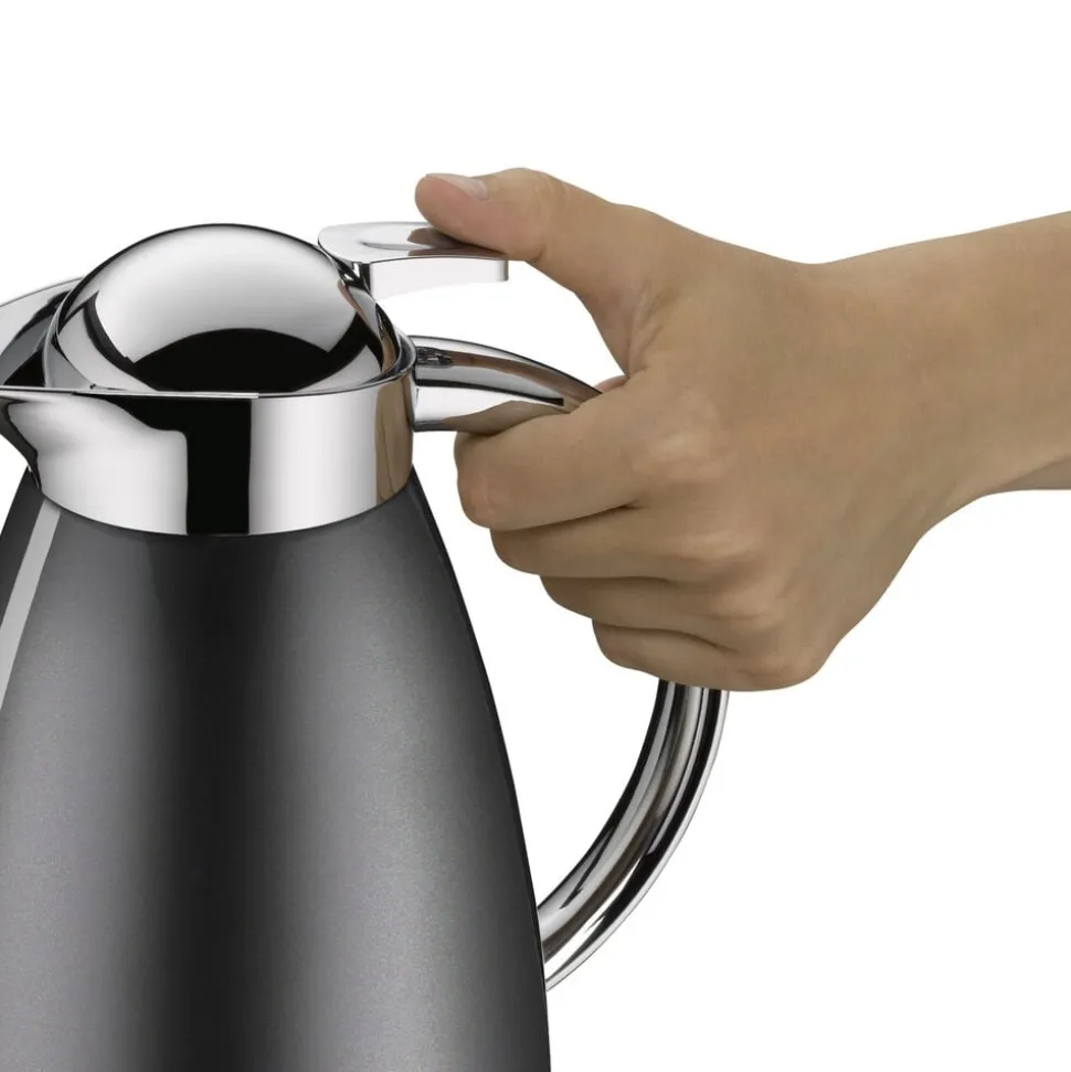 Alfi Signo matcher tidens trends med sit stilrene og minimalistiske design. Termokande i rustfrit stål. Dobbeltvægget AlfiDur-indsats i isolerende og hærdet vakuum-glas. Holder varmt i op til 12 timer og koldt i op til 24 timer. AromaSafe-princippet bevarer kaffens runde smag. Unikt og praktisk hældesystem. Kan betjenes med én hånd. Ergonomisk, forkromet metalhåndtag. Fri for BPA.