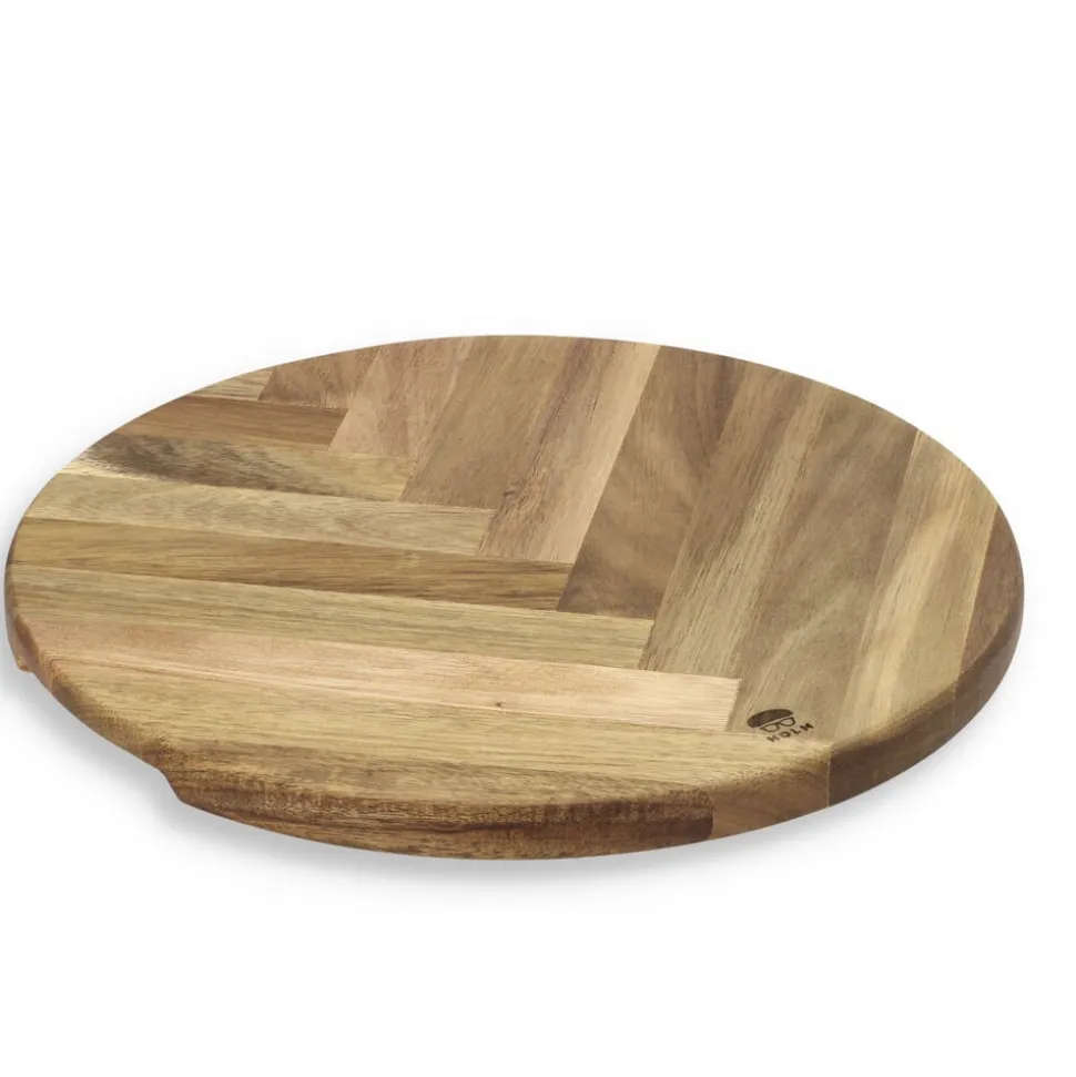Rundt serveringsbræt af akacietræ i flot sildebensmønster. Brug det flotte serveringsbræt til servering af pizza, pålæg, bruschetta og andre antipasti-retter, ost eller andre retter, der skal præsenteres flot. Dia. 30,5 cm.