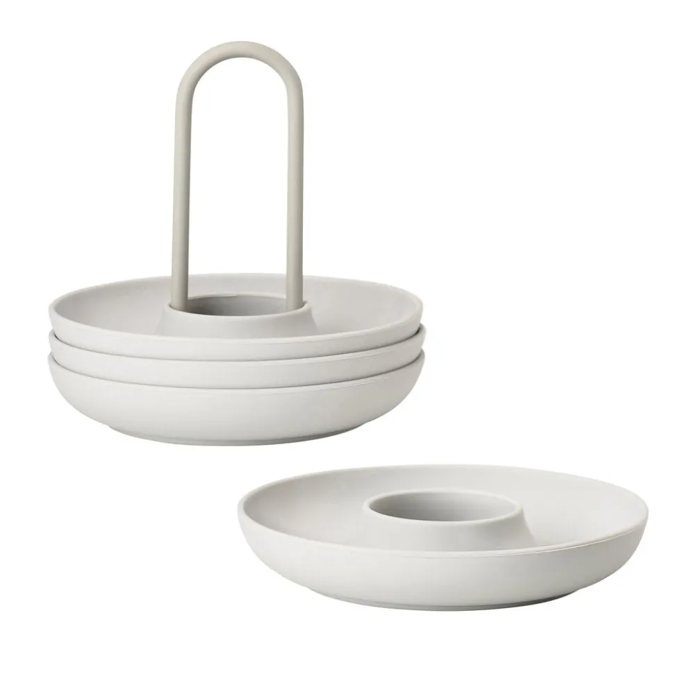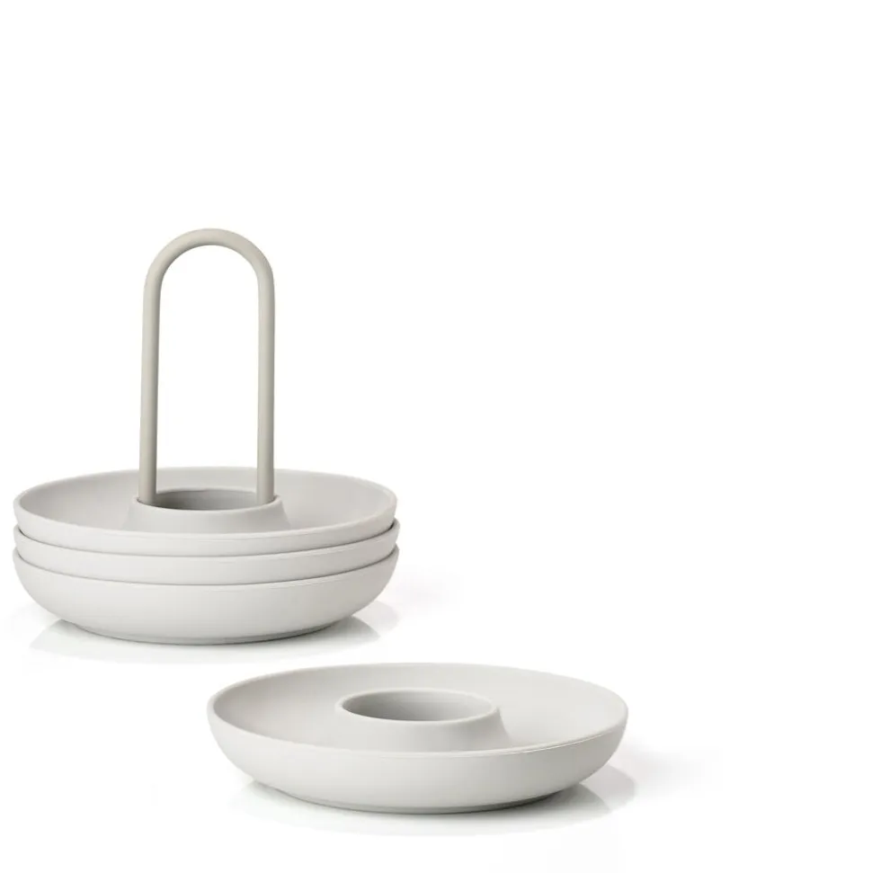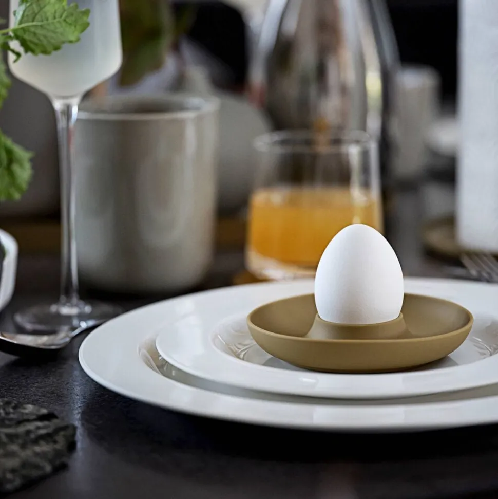 De fire æggebægre i holder fra Singles kan sættes på bordet med kun én hånd. Og den buede kant fanger både salt, æggeskaller og gæsternes opmærksomhed. Så kan du spise brunch med stil – fx i selskab med gode venner.