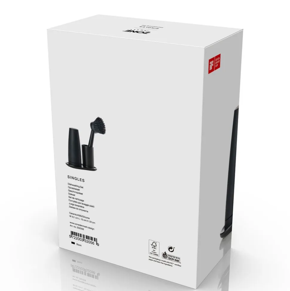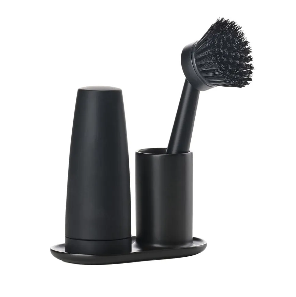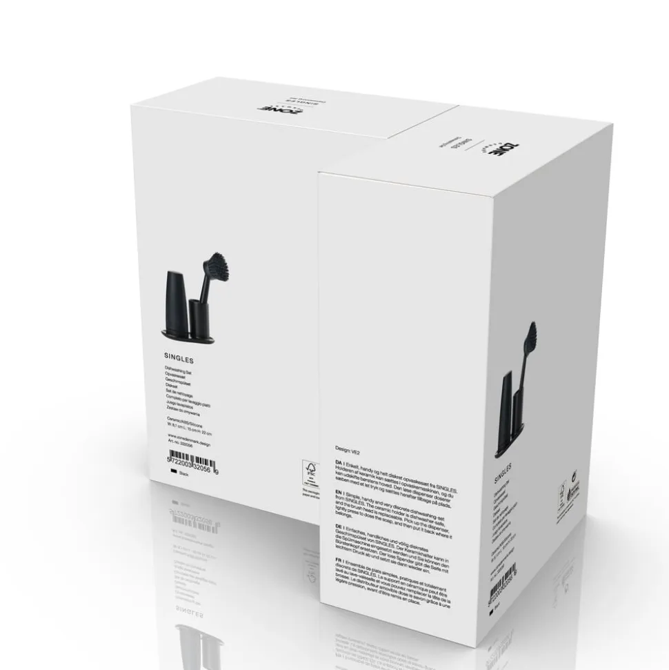 Enkelt, handy og helt diskret opvaskesæt fra Singles. Holderen af keramik kan sættes i opvaskemaskinen, og du kan udskifte børstens hoved. Den løse dispenser doserer sæben med et let tryk og sættes herefter tilbage på plads.