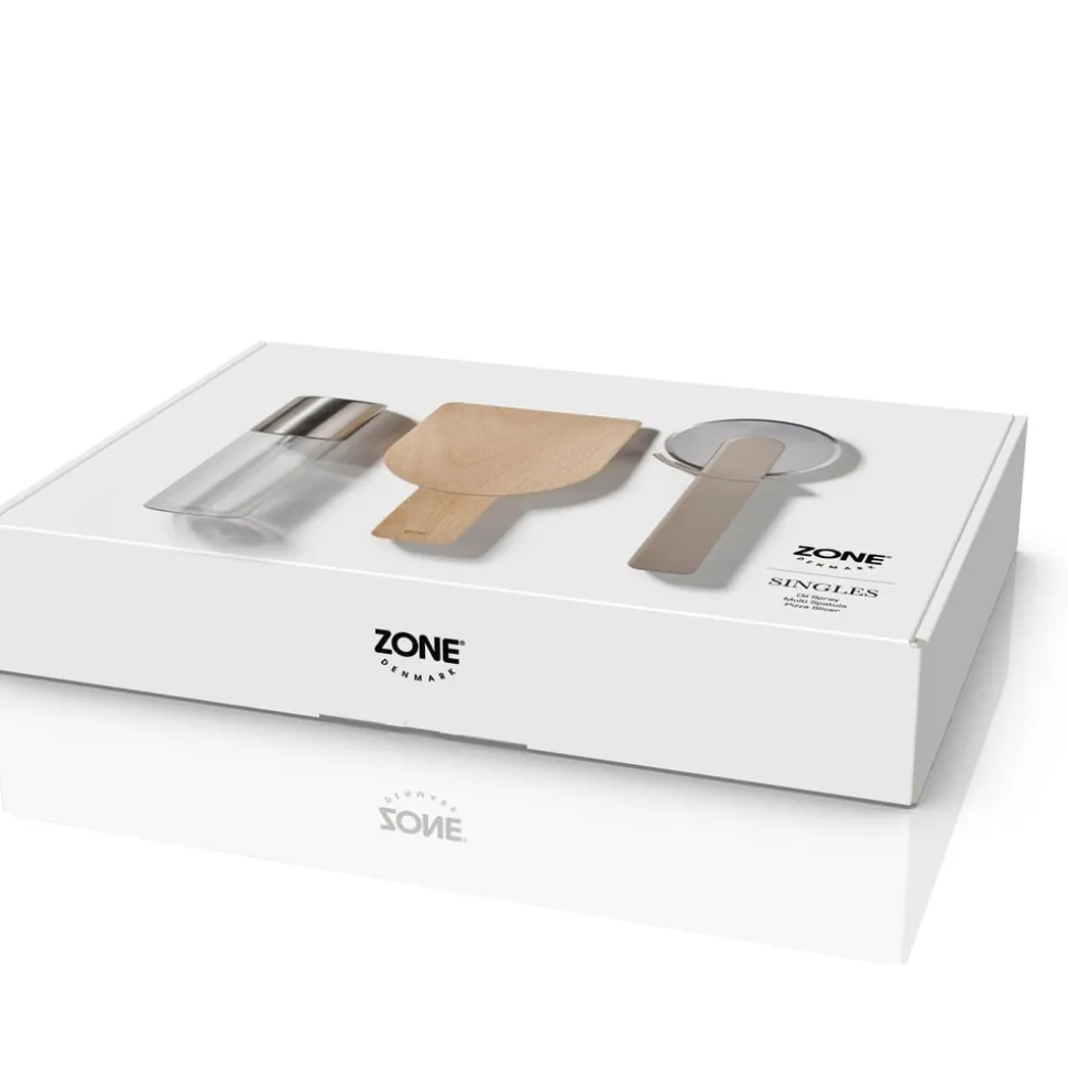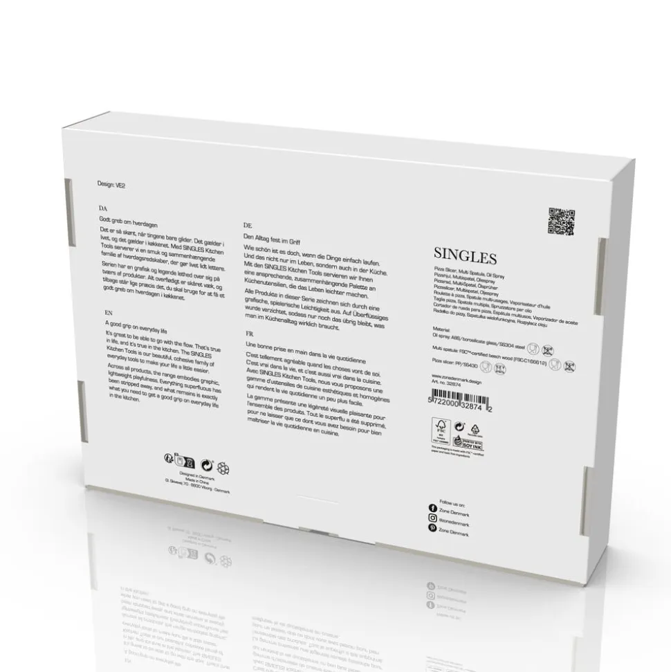 Pizzasættet består af 3 dele, Singles pizzahjul og Singles oliespray i Soft Taupe samt 18 x 10 cm multispatel i bøg.