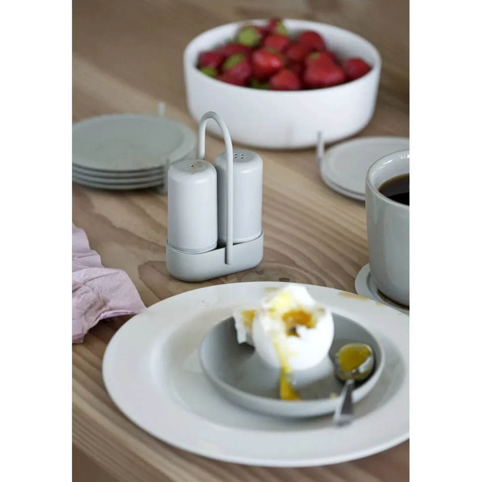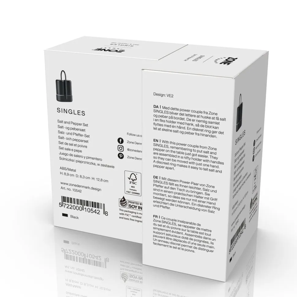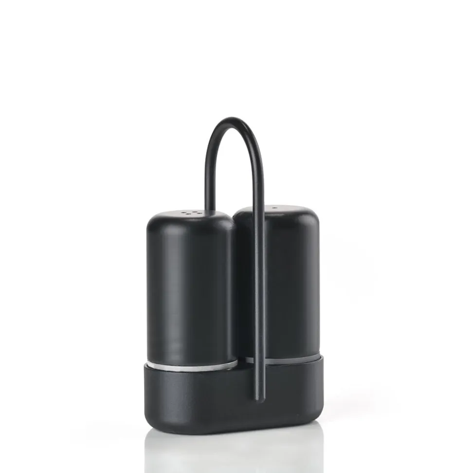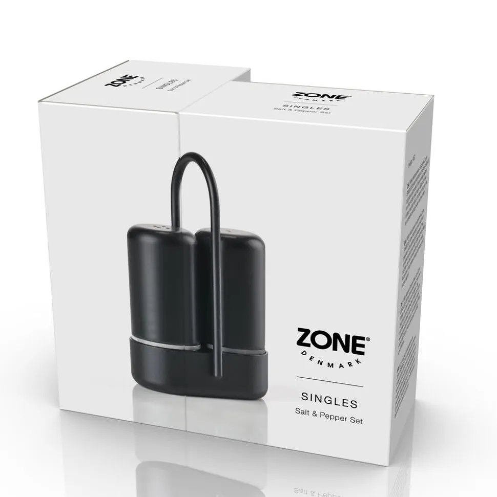 Med dette power couple fra Zone Singles bliver det lettere at huske at få salt og peber på bordet. De er nemlig samlet i en fiks holder med hank, så de blot kan flyttes med én hånd. En diskret ring gør det let at skelne salt og peber fra hinanden.