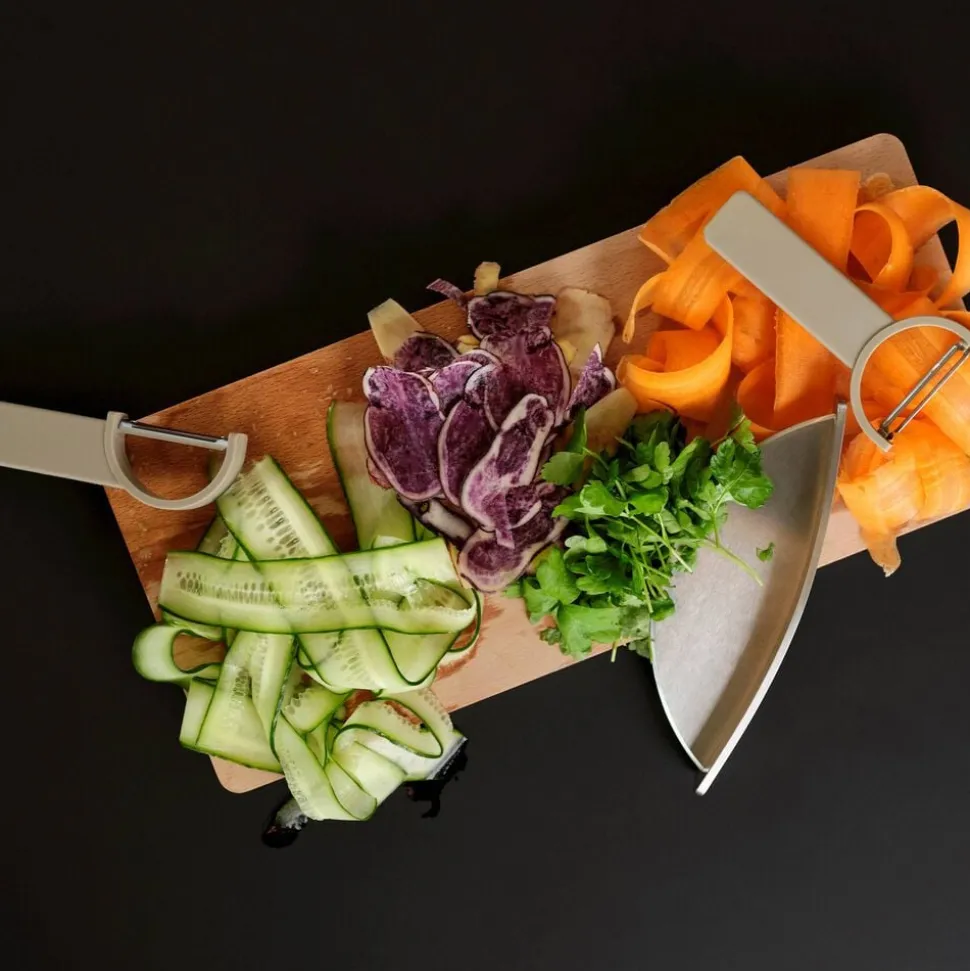 Effektivitet er i fokus, når du tager denne grøntsagsskræller frem fra køkkenskuffen. Det lille værktøj er en uvurderlig ven, når der hurtigt skal skrælles – uanset hvilken hånd, du foretrækker at bruge, eller hvilken retning, du vil skrælle i, væk fra eller imod dig selv. Klingen er lavet i knivskarpt kvalitetsstål, og grebet er godt.