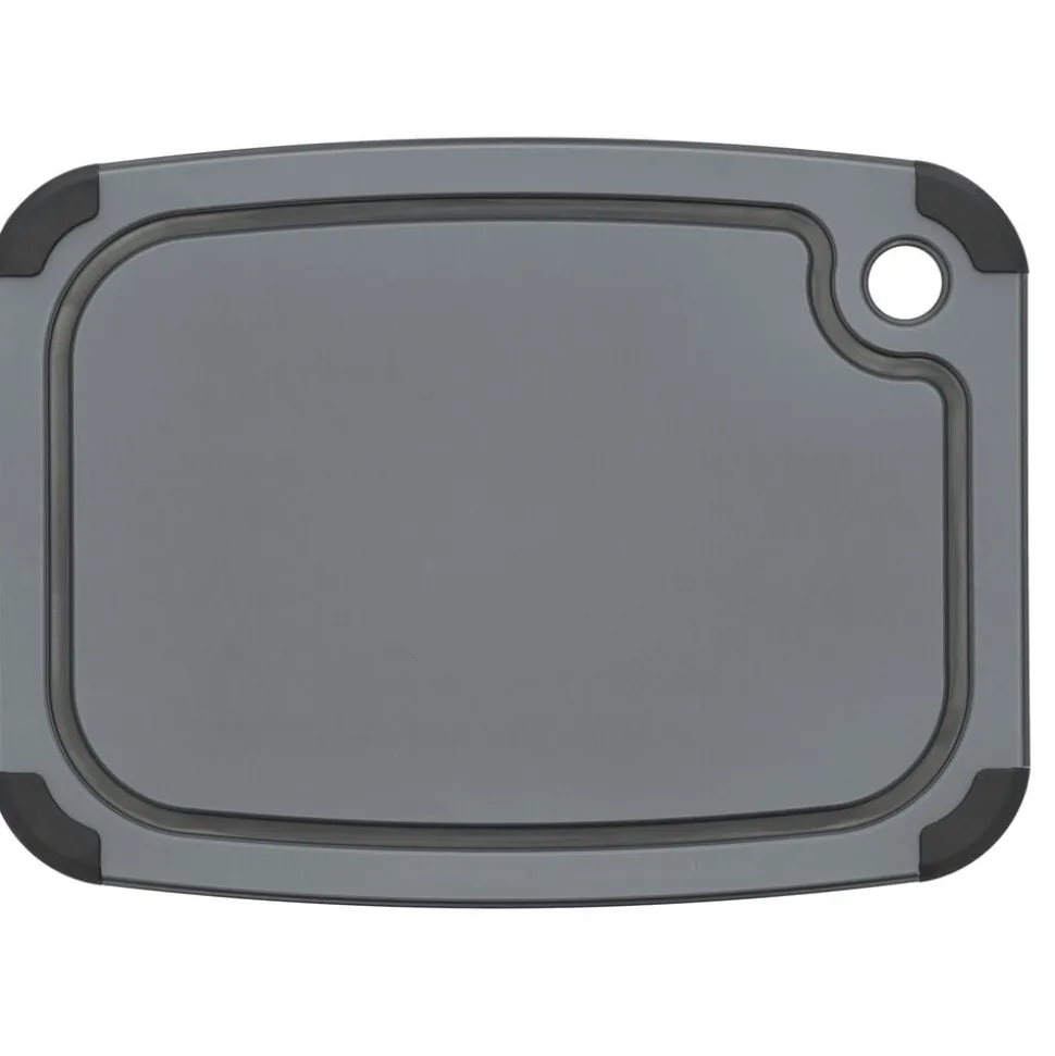 Skærebræt med praktiske silikonekanter, som sørger for, at brættet ligger stabilt på bordet, mens du hakker og skærer. Det kan anvendes på begge sider – den ene side har en bred saftrille til saftige madvarer og en glat side til alt det andet. Velegnet til opvaskemaskine.