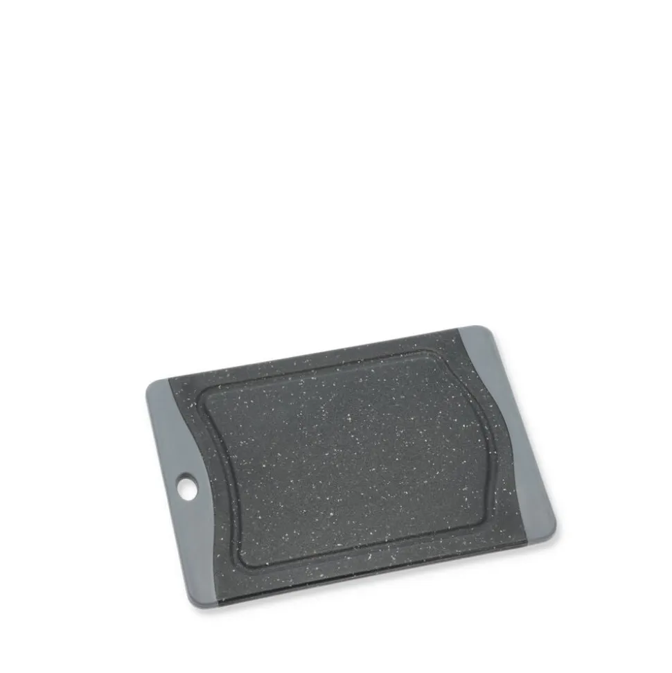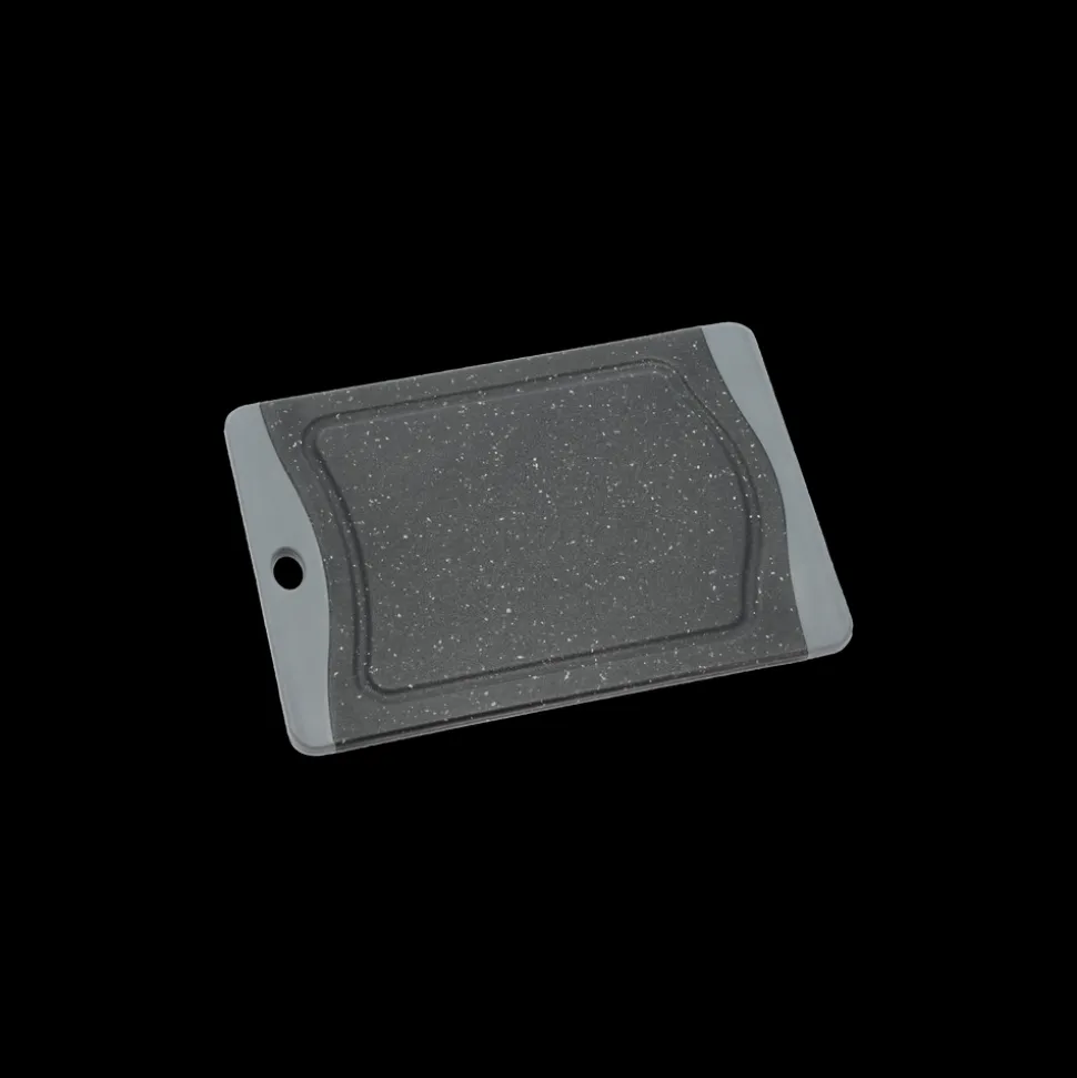 Skærebræt med kant i gråt gummi med anti-skrid-funktion. 20 x 14 x 0,8 cm. De skridsikre ender gør, at brættet ligger stabilt på bordet. Skærebrættet er forsynet med saftriller. Nemt at rengøre. Skærebrættet er fremstillet med en skæreflade i PP plast og en kant i TPE gummi.