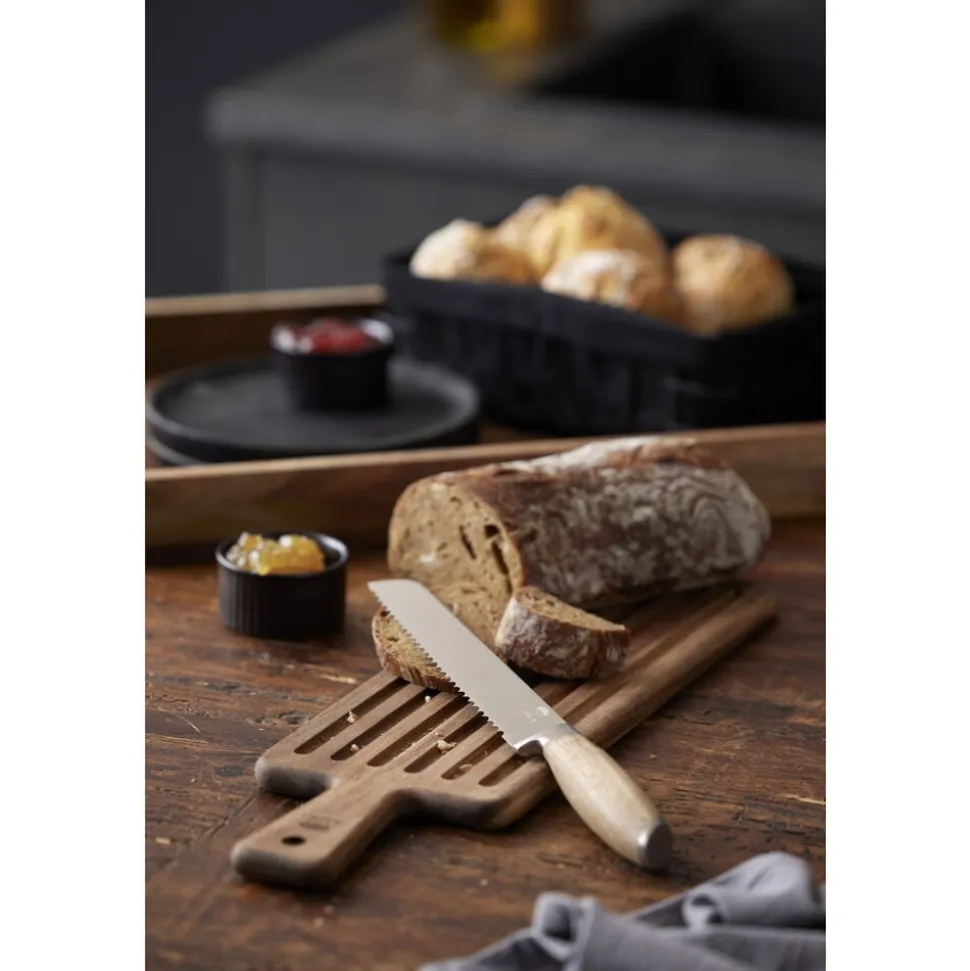 Det fine brødsæt består af et stort skærebræt af smukt akacietræ, 46 x 13,8 x 1,5 cm, og en savtakket brødkniv i rustfrit stål og akacietræ. Knivens runde håndtag ligger godt i hånden, og skærebrættet har riller, der opsamler brødkrummerne.