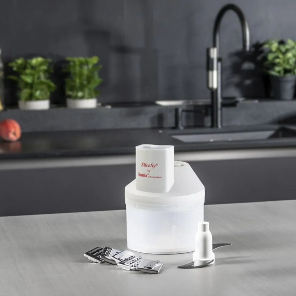 bamix®-tilbehør. SliceSy® til at hakke, rive, snitte og kværne – det hele klaret på den halve tid. Kan også bruges til at røre og blande dej. Produktet har en kapacitet på ca. 6 dl og leveres med 5 knivblade.
