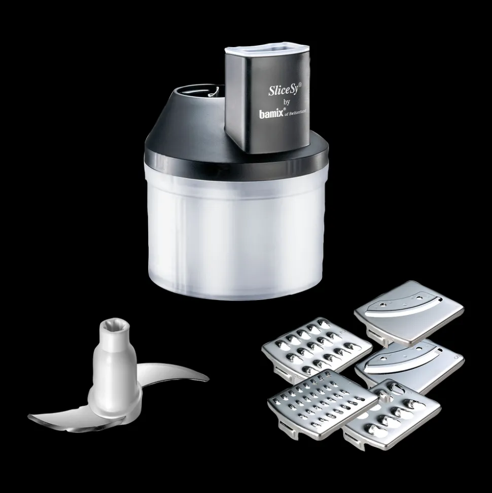bamix®-tilbehør. SliceSy® til at hakke, rive, snitte og kværne – det hele klaret på den halve tid. Kan også bruges til at røre og blande dej. Produktet har en kapacitet på ca. 6 dl og leveres med 5 knivblade.