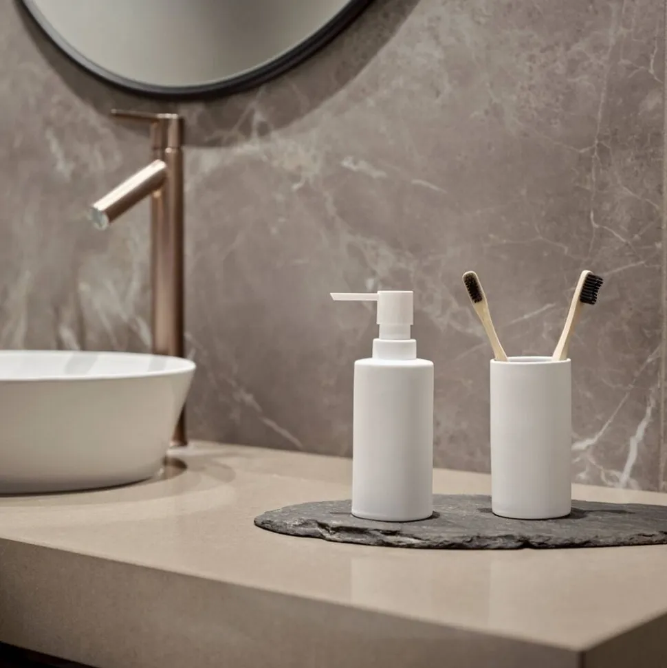 Med Solo badserie er der helt rene linjer. Produkterne er samtidig holdt i rene farver og står rent, flot og funktionelt i badeværelset. Sæbedispenseren rummer 0,3 l og matcher tandbørstekrus, toiletbørste og pedalspand perfekt.