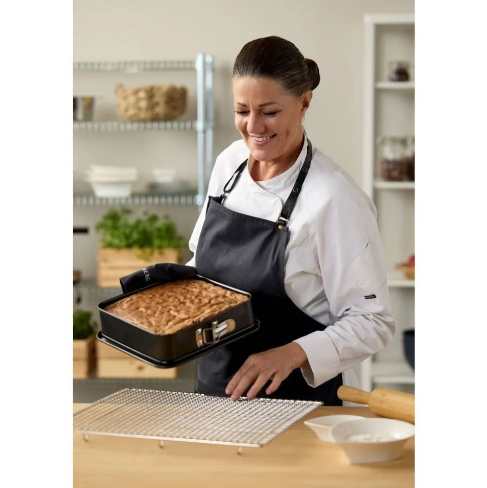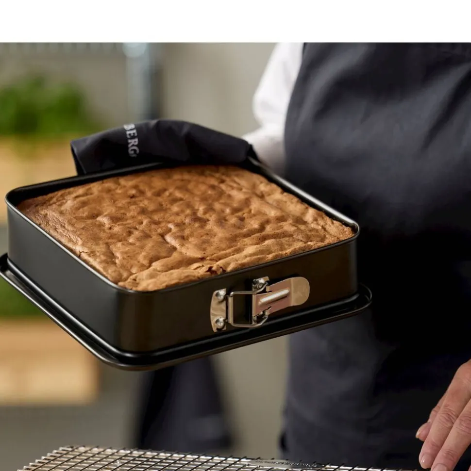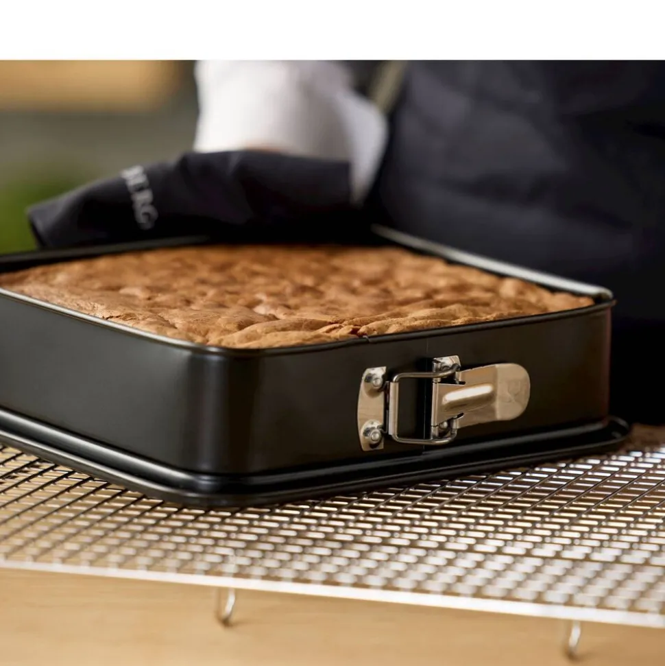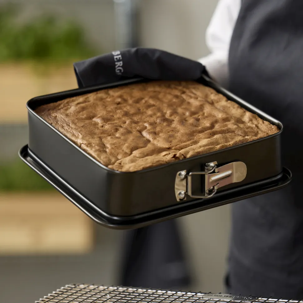 Kvadratisk springform i let stål med non-stick belægning. Anvendes til alle slags bagte rørekager som fx chokoladekage, til lækre brød og tykke lagkage- og dessertbunde. Smør formen indvendigt ved bagning. Vaskes i opvaskemaskine før første brug. Den keramiske belægning er fremstillet af råvarer, der ikke indeholder PFAS.