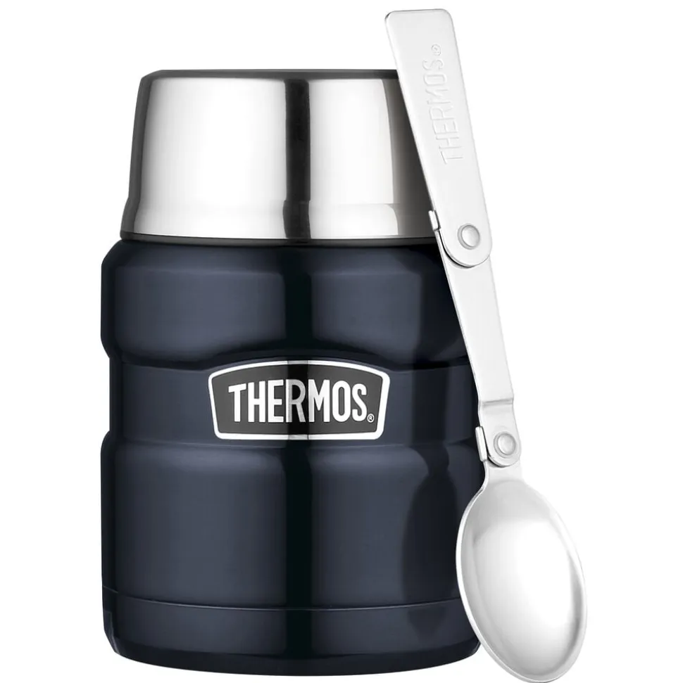 Thermos Stainless King 470 ml madtermoflaske i rustfrit stål med foldbar ske i låget. Låget kan bruges som spiseskål til fx suppe eller som kop til dine drikkevarer. Velegnet til både kolde og varme drikke, og holder indholdet varmt i op til 9 timer og koldt i op til 14 timer.
