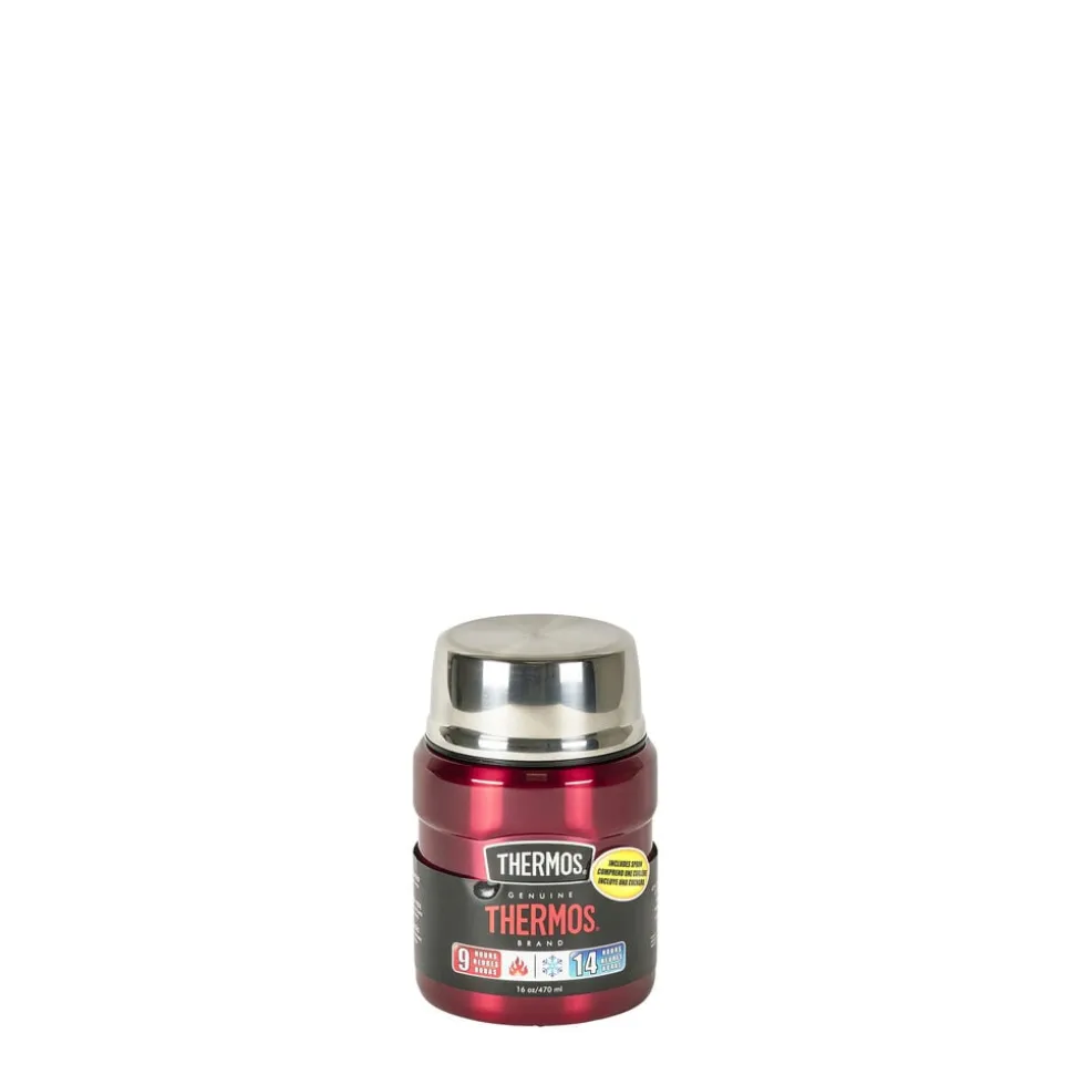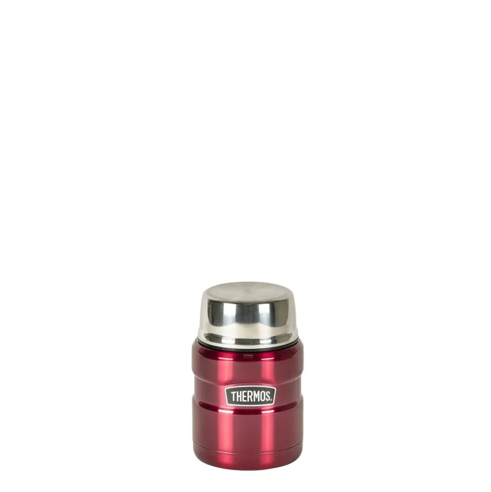 Thermos Stainless King 470 ml madtermoflaske i rustfrit stål med foldbar ske i låget. Låget kan bruges som spiseskål til fx suppe eller som kop til dine drikkevarer. Velegnet til både kolde og varme drikke, og holder indholdet varmt i op til 9 timer og koldt i op til 14 timer.