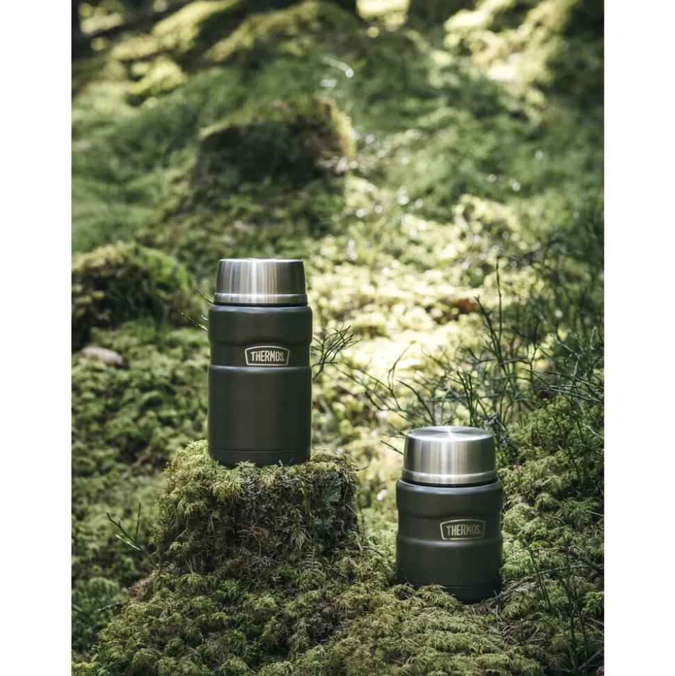 Thermos Stainless King 470 ml madtermoflaske i rustfrit stål med foldbar ske i låget. Låget kan bruges som spiseskål til fx suppe eller som kop til dine drikkevarer. Velegnet til både kolde og varme drikke, og holder indholdet varmt i op til 9 timer og koldt i op til 14 timer.