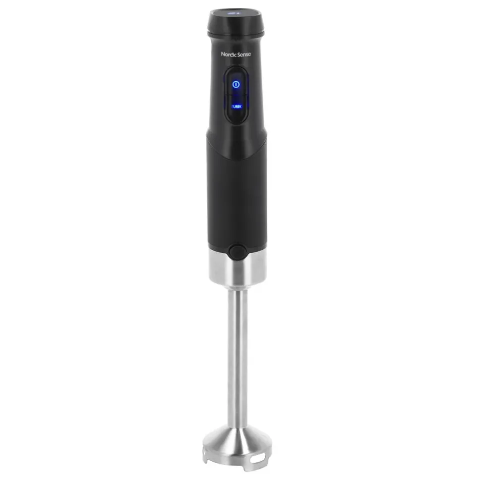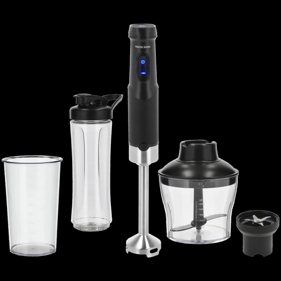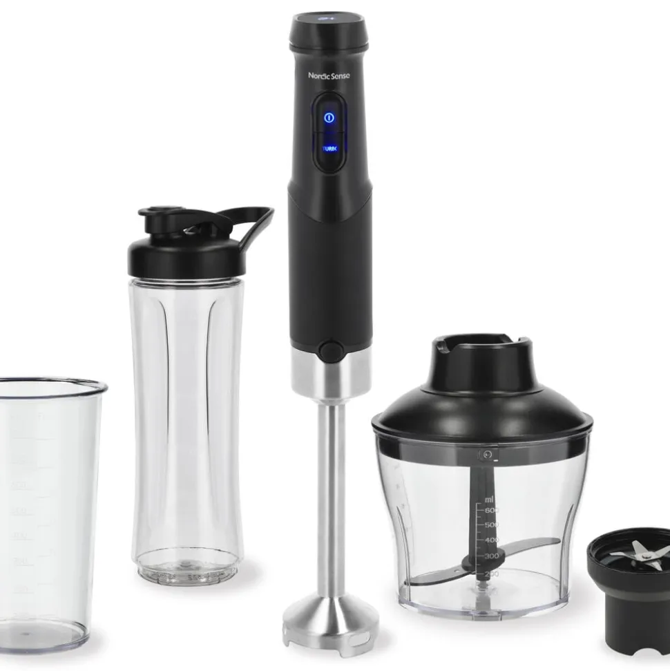 Stavblendersættet indeholder en minihakker på 600 ml, et mixebæger på 800 ml og en smoothieflaske på 600 ml, hvor du kan blende smoothies direkte og tage dem med på farten. Du kan vælge mellem 12 hastigheder, som vises på displayet på toppen af blenderstaven. ON/OFF-knap og turbo-funktion gør betjeningen enkel.