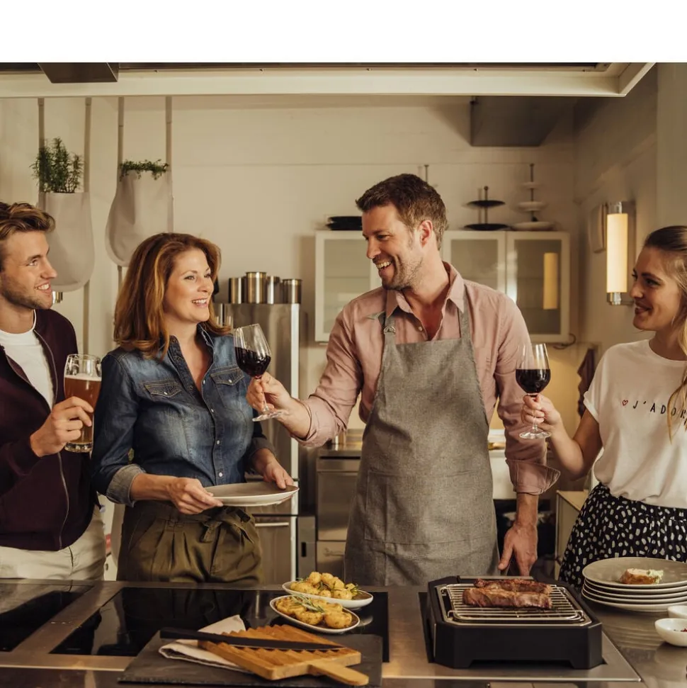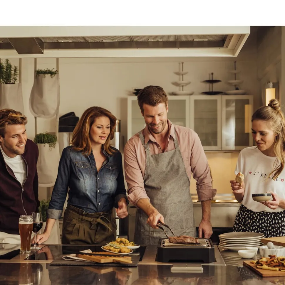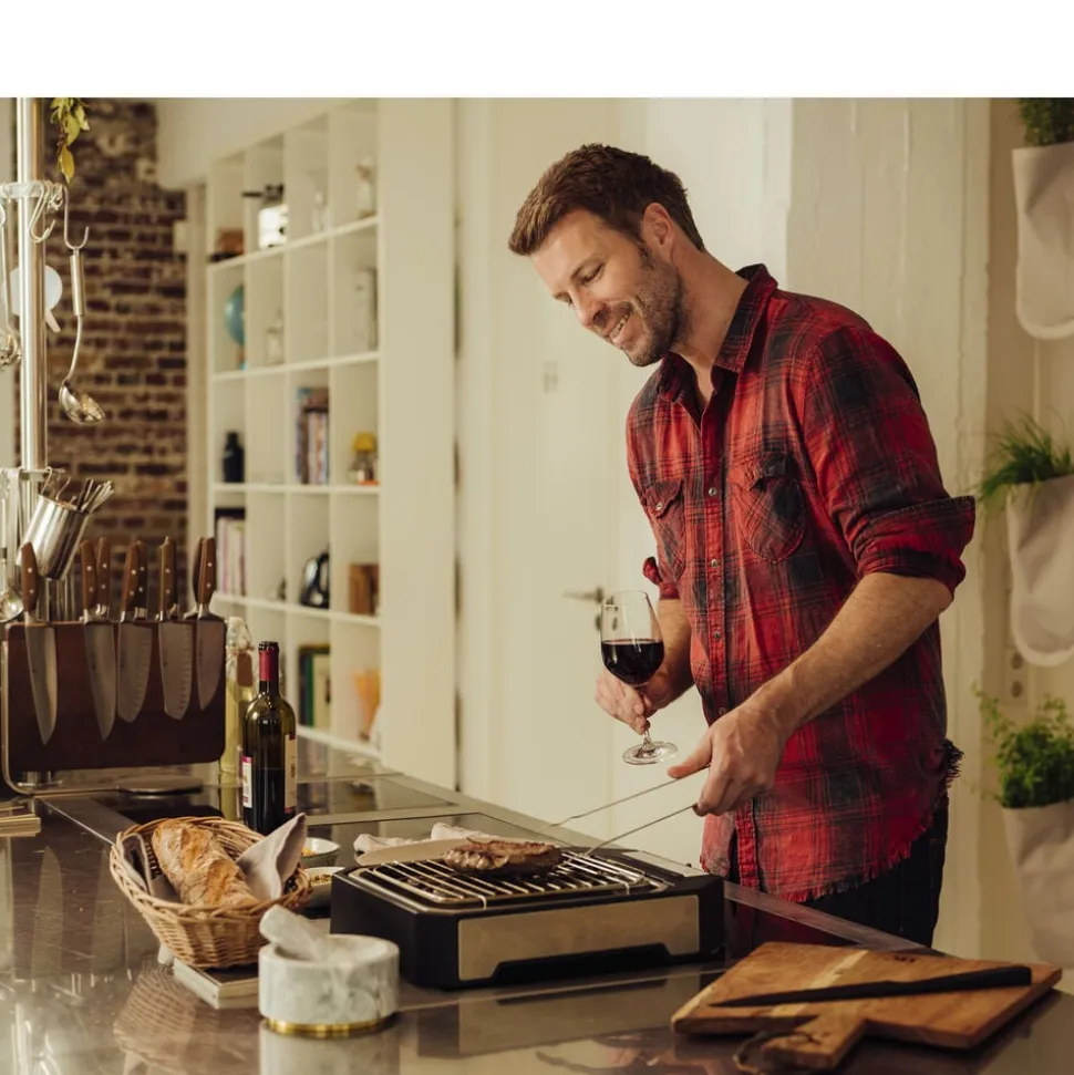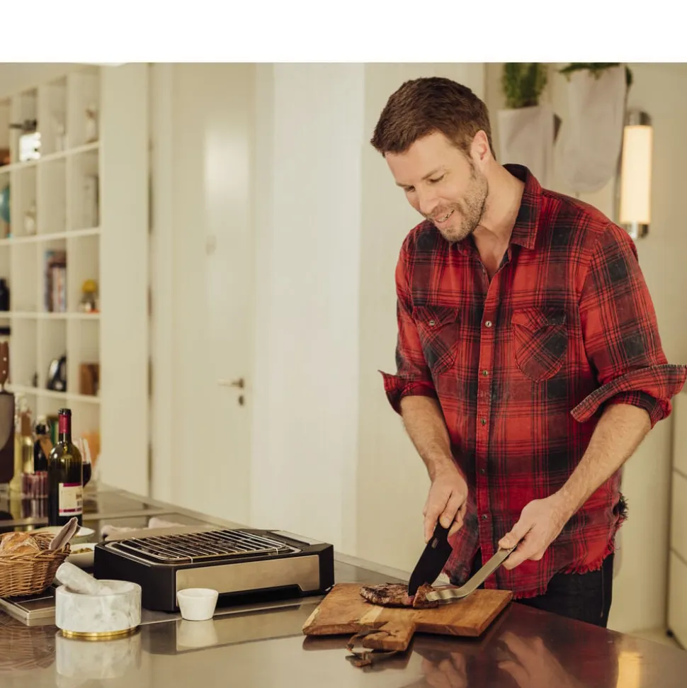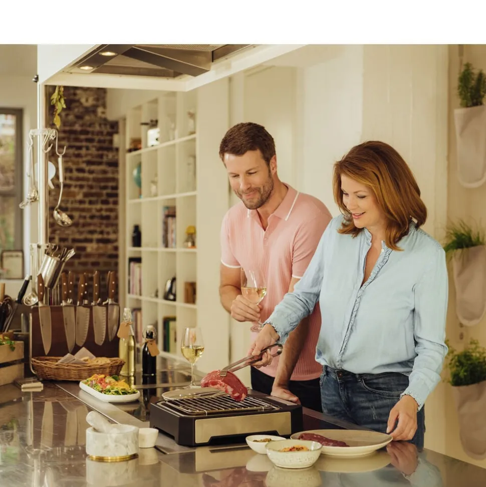 På den smarte steakgrill med grillrist og specialdesignet reflektorbakke kan du stege perfekte bøffer med den rigtige grillskorpe udenpå og bløde og saftige indeni. Med to indstillinger: hurtig svitsning (op til 500 grader) og moderat grillning. Grilloverfladen måler ca. 21 x 21,5 cm. Let at skille ad og rengøre. 2300 watt.