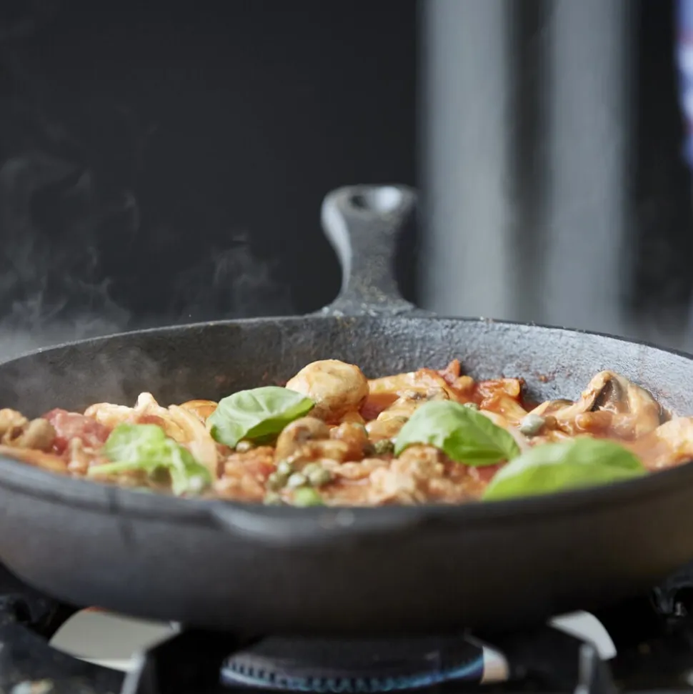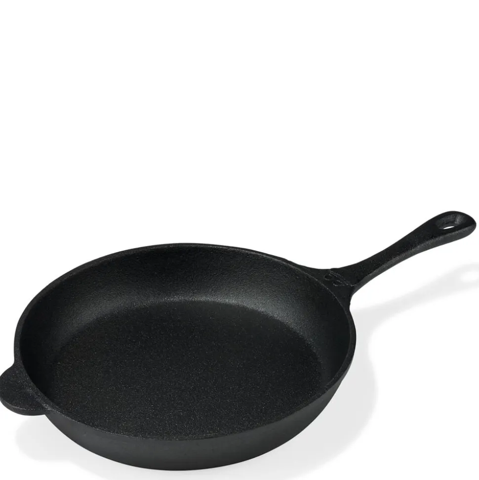 Stegepande i støbejern. Mange muligheder i køkkenet – baked beans, klassisk æggekage, lyngullasch, bagt Shepherds pie, kartoffelfrikasse, svinekotelet i tomat og rosmarin.