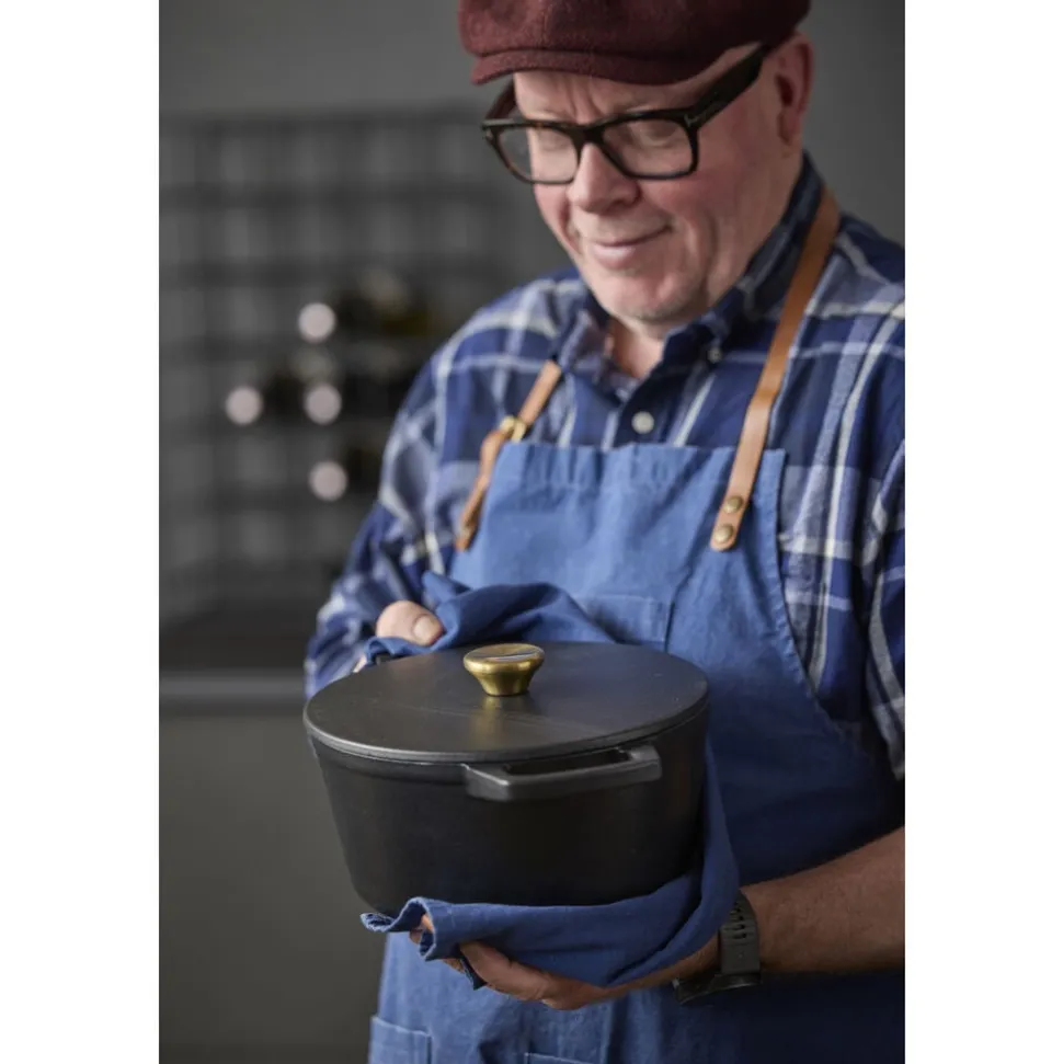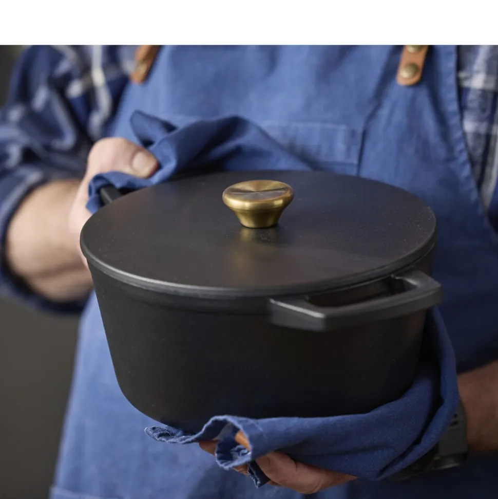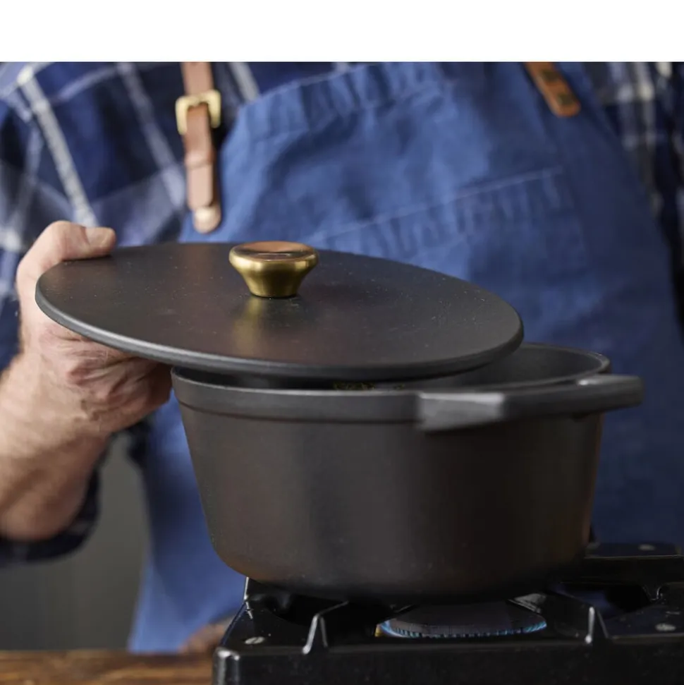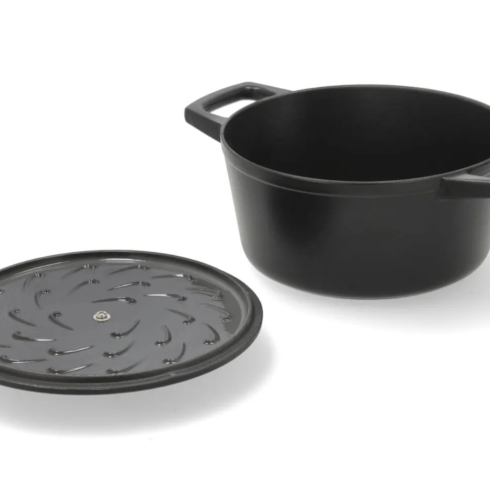 Støbejernsgryde, 3,6 liter, med en 3-lags mat sort emaljecoating. Gryden har grædelåg, det vil sige, at et relief på indersiden af låget opfanger den varme damp og lader den dryppe tilbage i gryden og give smag til retten. Støbejern holder godt på varmen og fordeler den jævnt og effektivt. Gryden kan anvendes på alle varmekilder samt i ovn og på grill. Det er vigtigt at løfte gryden, når du skal flytte på den – skub den aldrig frem og tilbage på komfuret, da det kan ridse. Støbejern er ikke egnet til sure fødevarer og må aldrig benyttes til langtidsopbevaring. Redskaber i træ, plast eller silikone anbefales. Håndopvask med varmt vand og opvaskemiddel anbefales, også inden første brug. Sørg for at støbejern er helt tørt, inden det sættes væk, så der ikke dannes rust.