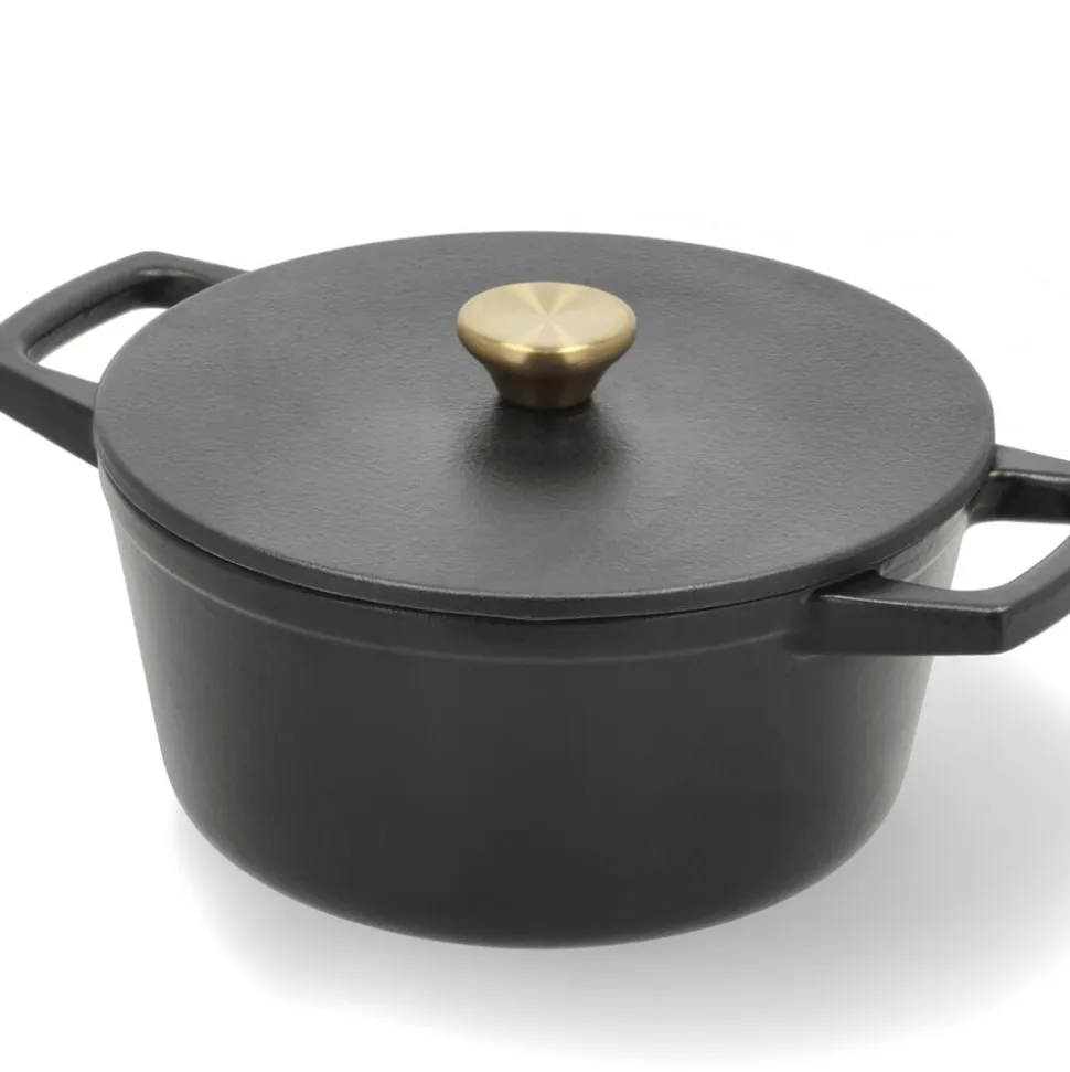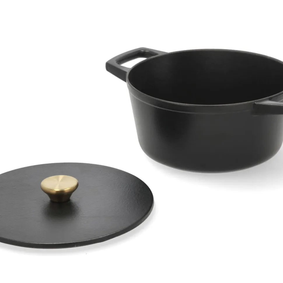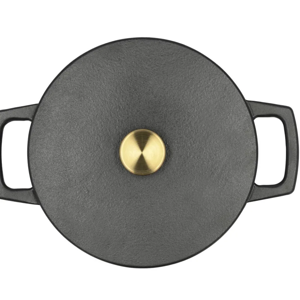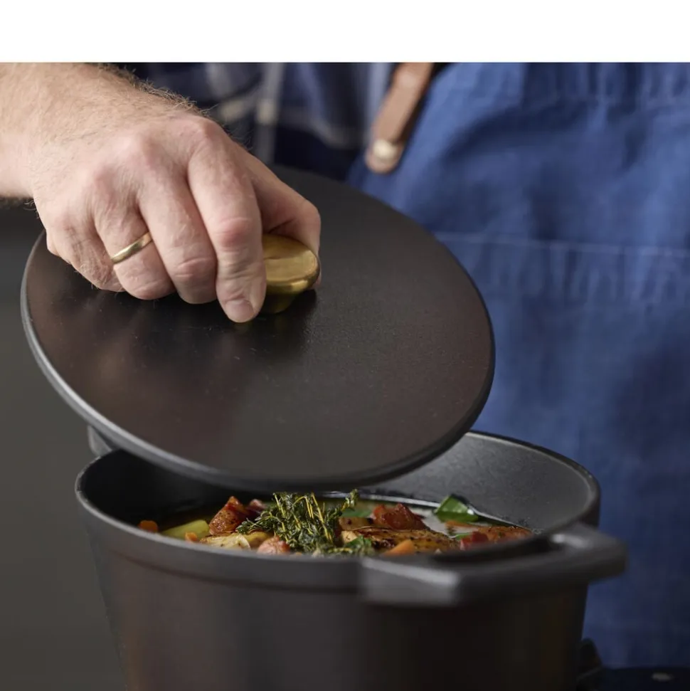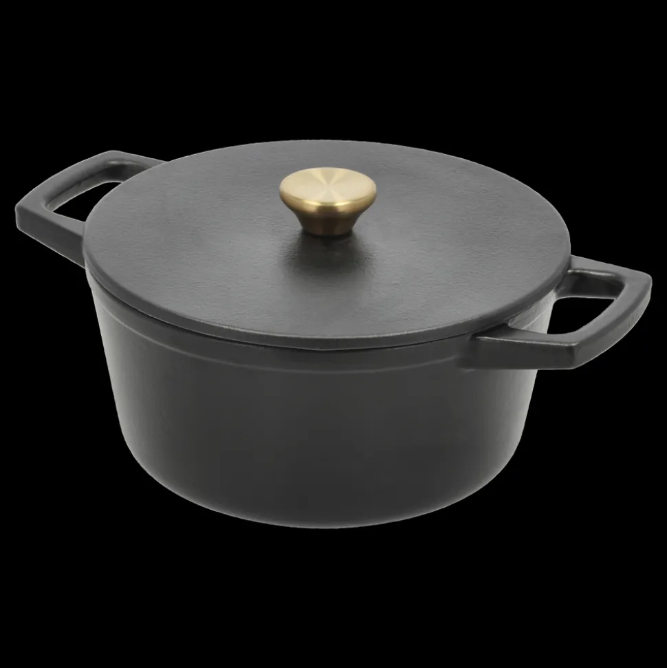 Støbejernsgryde, 3,6 liter, med en 3-lags mat sort emaljecoating. Gryden har grædelåg, det vil sige, at et relief på indersiden af låget opfanger den varme damp og lader den dryppe tilbage i gryden og give smag til retten. Støbejern holder godt på varmen og fordeler den jævnt og effektivt. Gryden kan anvendes på alle varmekilder samt i ovn og på grill. Det er vigtigt at løfte gryden, når du skal flytte på den – skub den aldrig frem og tilbage på komfuret, da det kan ridse. Støbejern er ikke egnet til sure fødevarer og må aldrig benyttes til langtidsopbevaring. Redskaber i træ, plast eller silikone anbefales. Håndopvask med varmt vand og opvaskemiddel anbefales, også inden første brug. Sørg for at støbejern er helt tørt, inden det sættes væk, så der ikke dannes rust.