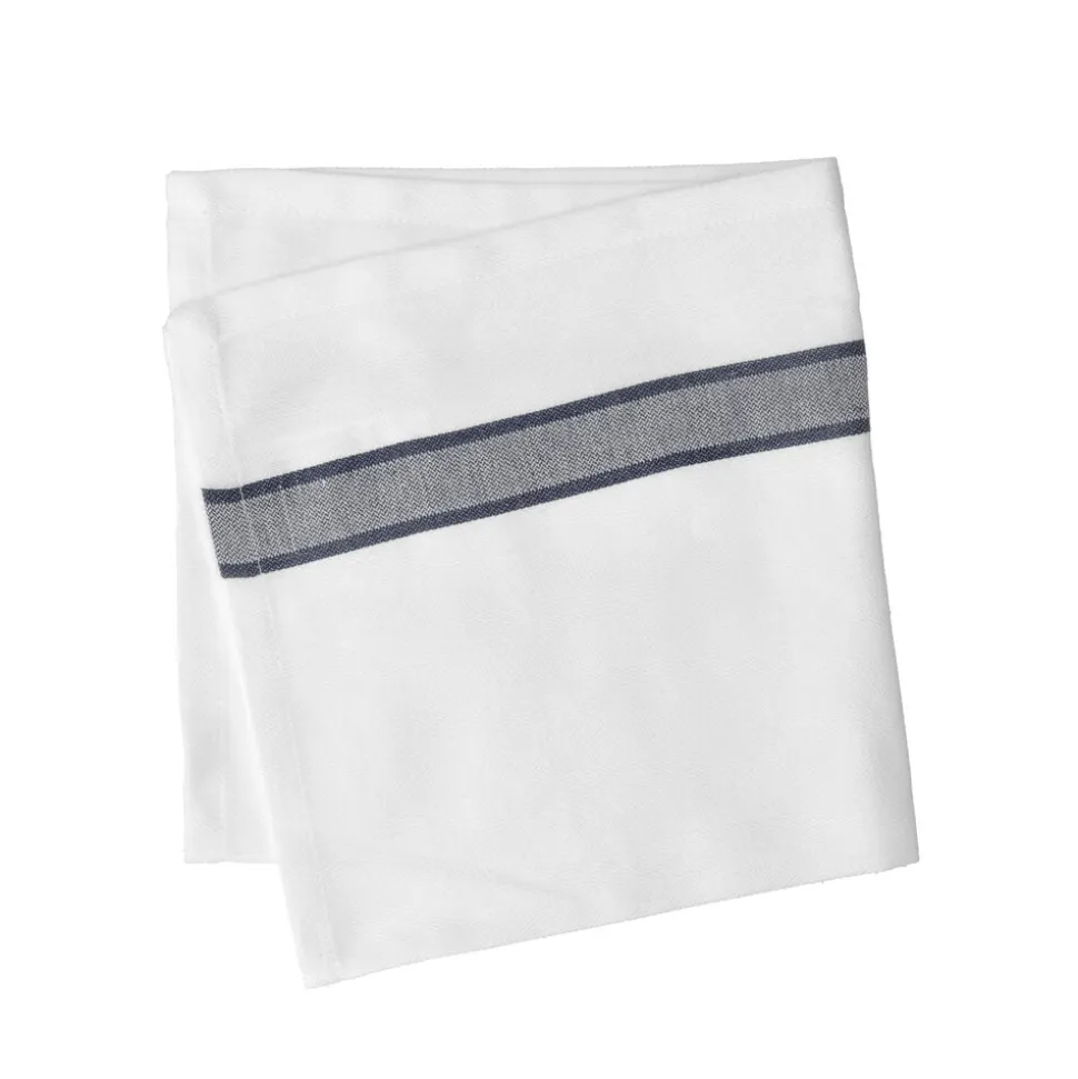 Stofserviet fremstillet i 100 % bomuld. Det klassiske hvide stof kombineret med en enkel farvet stribe giver mulighed for et let og personligt udtryk. Servietten er blød, behagelig og nem at folde, så du kan variere udtrykket, når borddækningen skal have lidt ekstra opmærksomhed.