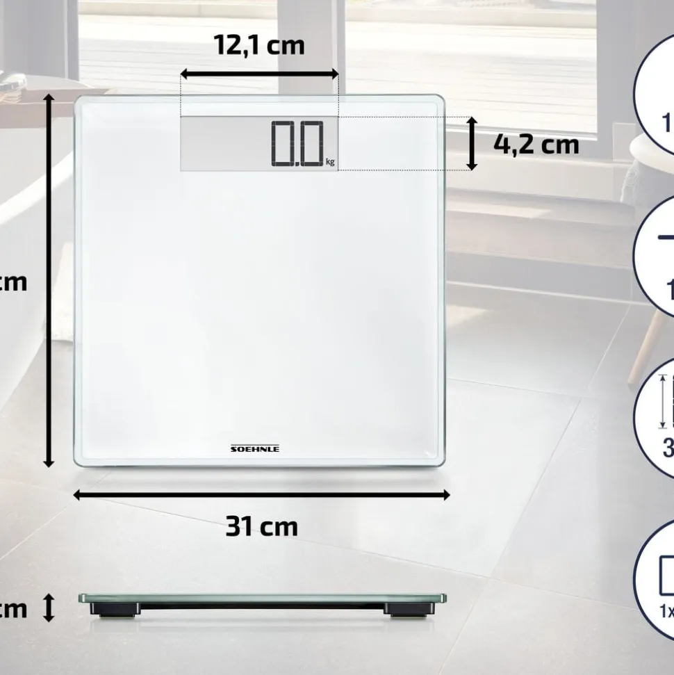 Style Sense Comfort 100 er en praktisk personvægt i smart design. Den er udstyret med en stabil platform i 8 mm sikkerhedsglas og tænder automatisk, når du træder op. Vægten måler op til 180 kg interval på 100 g, og resultatet vises tydeligt på det letlæselige display. Du kan vælge mellem kg, lb eller st.