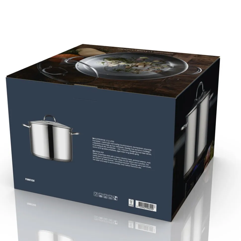 Suppegryde, 17,2 liter, fremstillet i rustfrit stål med kraftig induktionsbund, blankpoleret udvendigt, matpoleret indvendigt og med måleskala.