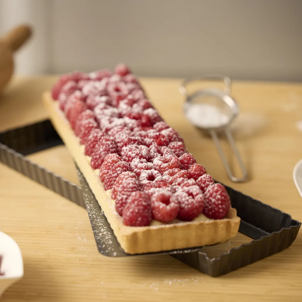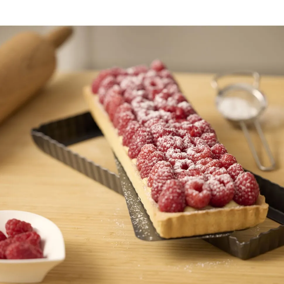 Rektangulær tærteform til alle typer dessert- og madtærter. Den løse bund gør det let at få tærten ud i et helt og pænt stykke – klar til servering. Non-stick belægningen sikrer, at dejen slipper let, men for det bedste resultat anbefales det altid at smøre formen med lidt bagespray eller en smagsneutral olie. For at beskytte belægningen anbefales det at bruge redskaber af træ, silikone eller plast samt at vaske tærteformen op i hånden.