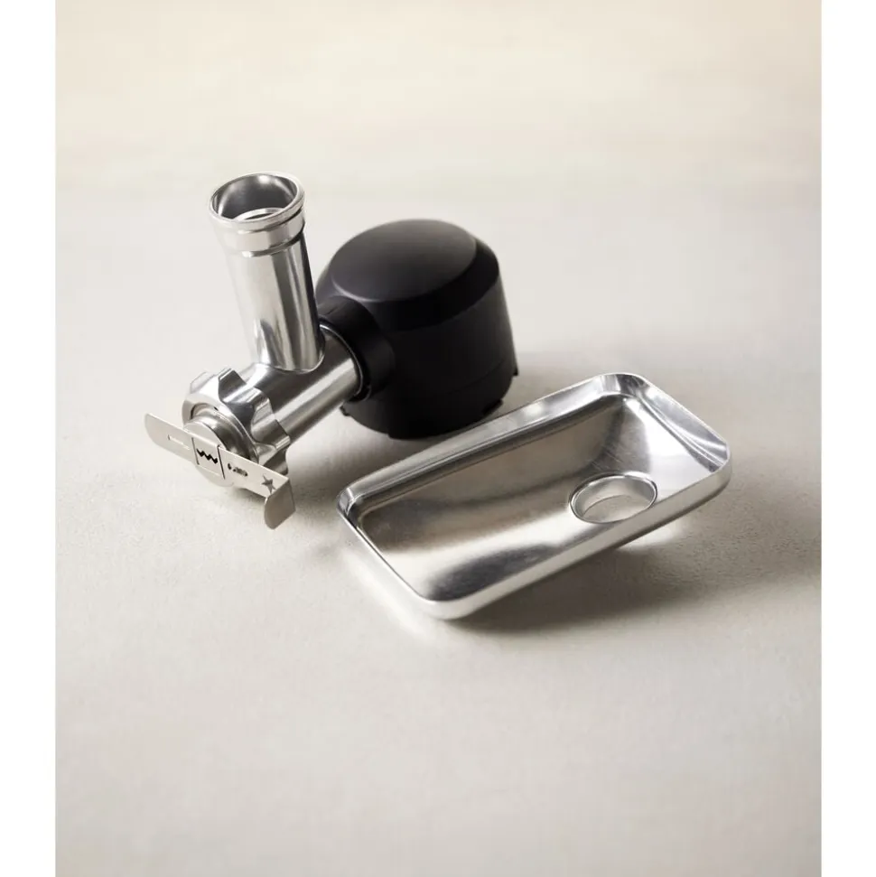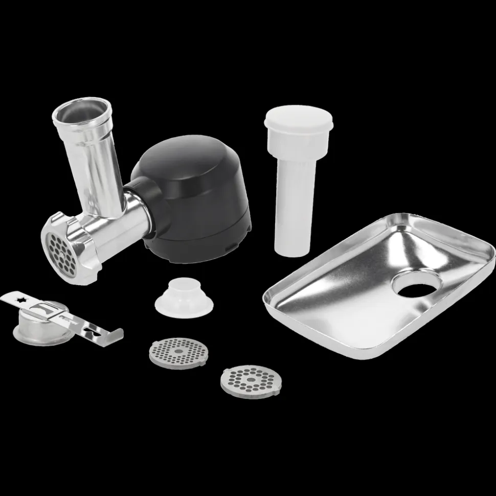 Tilbehørssæt til Blomsterbergs køkkenmaskine XL bestående af kødhakker, pølsehorn og kageplade.
