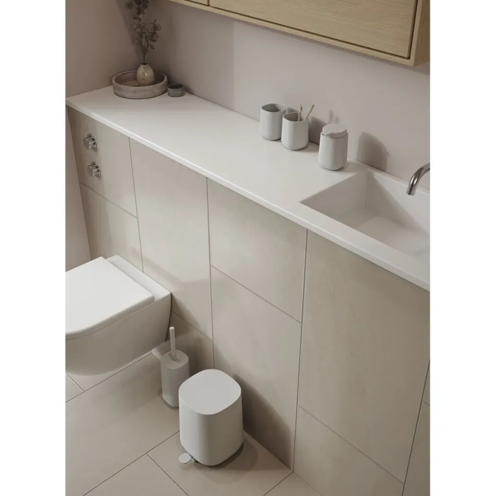 TIME badserien får dig til at kigge en ekstra gang. Tre af seriens fire produkter – nemlig sæbedispenser, tandbørstekrus og toiletbørste – er udført i beton og blot suppleret med få plast-detaljer. Pedalspanden er derimod ren ABS-plast, men matcher beton-produkterne farvemæssigt, så serien fremstår som én stærk helhed. Beton er kendt for sin kompromisløse karisma og naturlighed og har de senere år vundet indpas i boligindretningen. Det er på én gang hårdt, blødt og meget smukt. Endelig er det et lidt mere energibesparende materiale end fx keramik, da det ikke skal brændes ved høj temperatur.