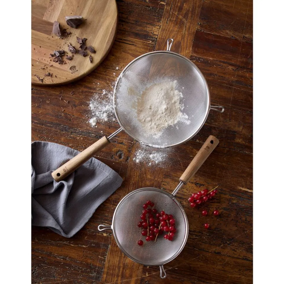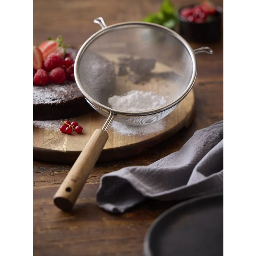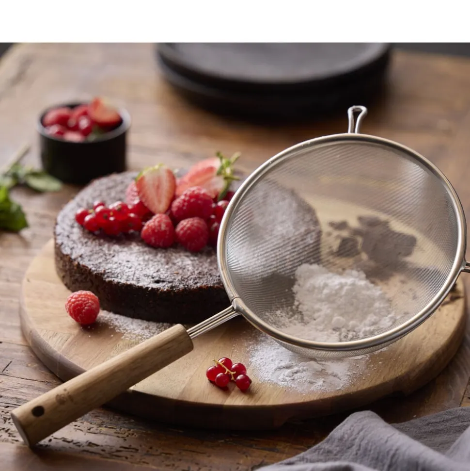 Denne klassiske trådsigte af rustfrit stål med håndtag af smukt akacietræ hører hjemme i ethvert køkken. Det fintmaskede net er perfekt til at sigte mel, sukker, kakao og andre tørre ingredienser, samt til at mose frugt eller bær og sigte supper og sovse. Dia. 16 cm.