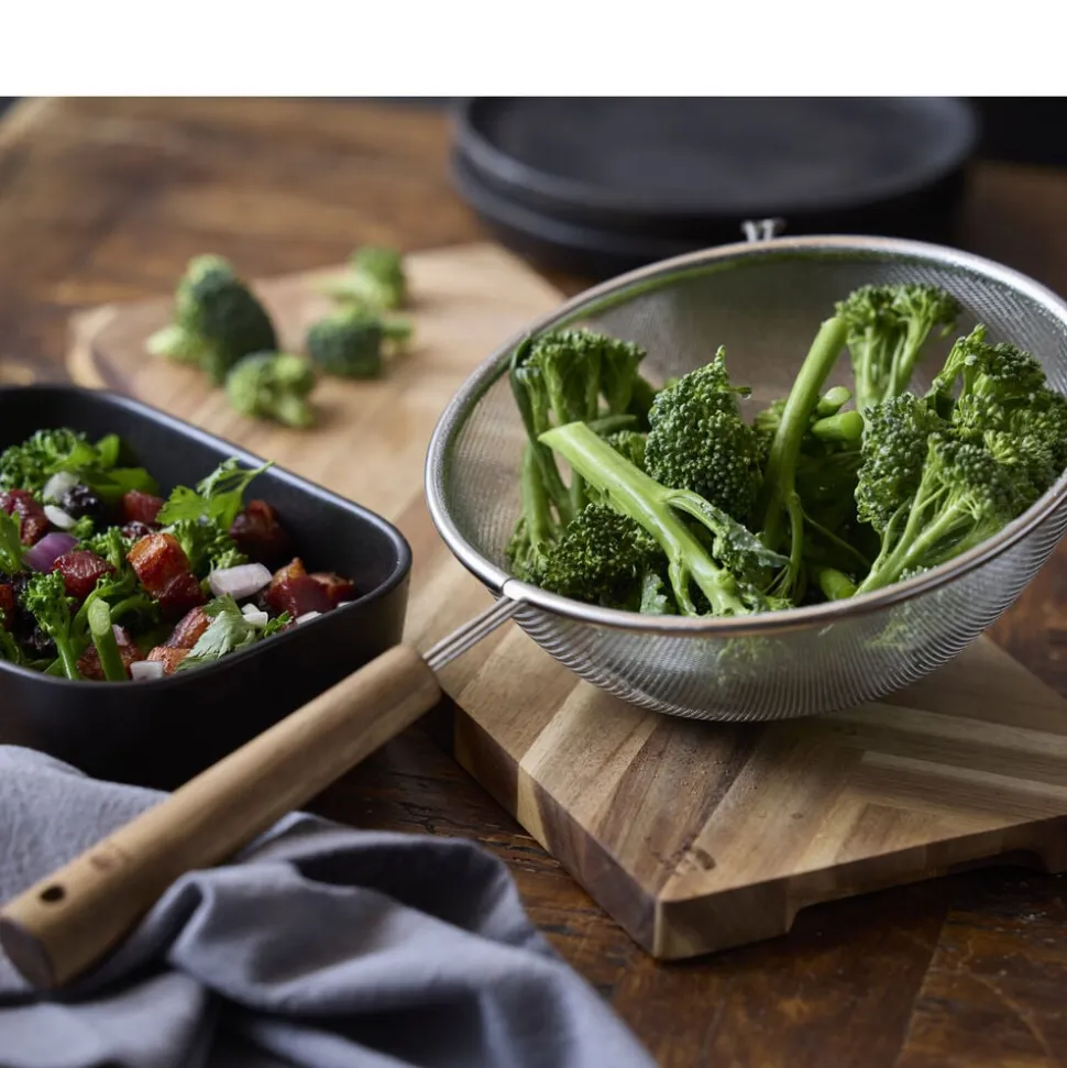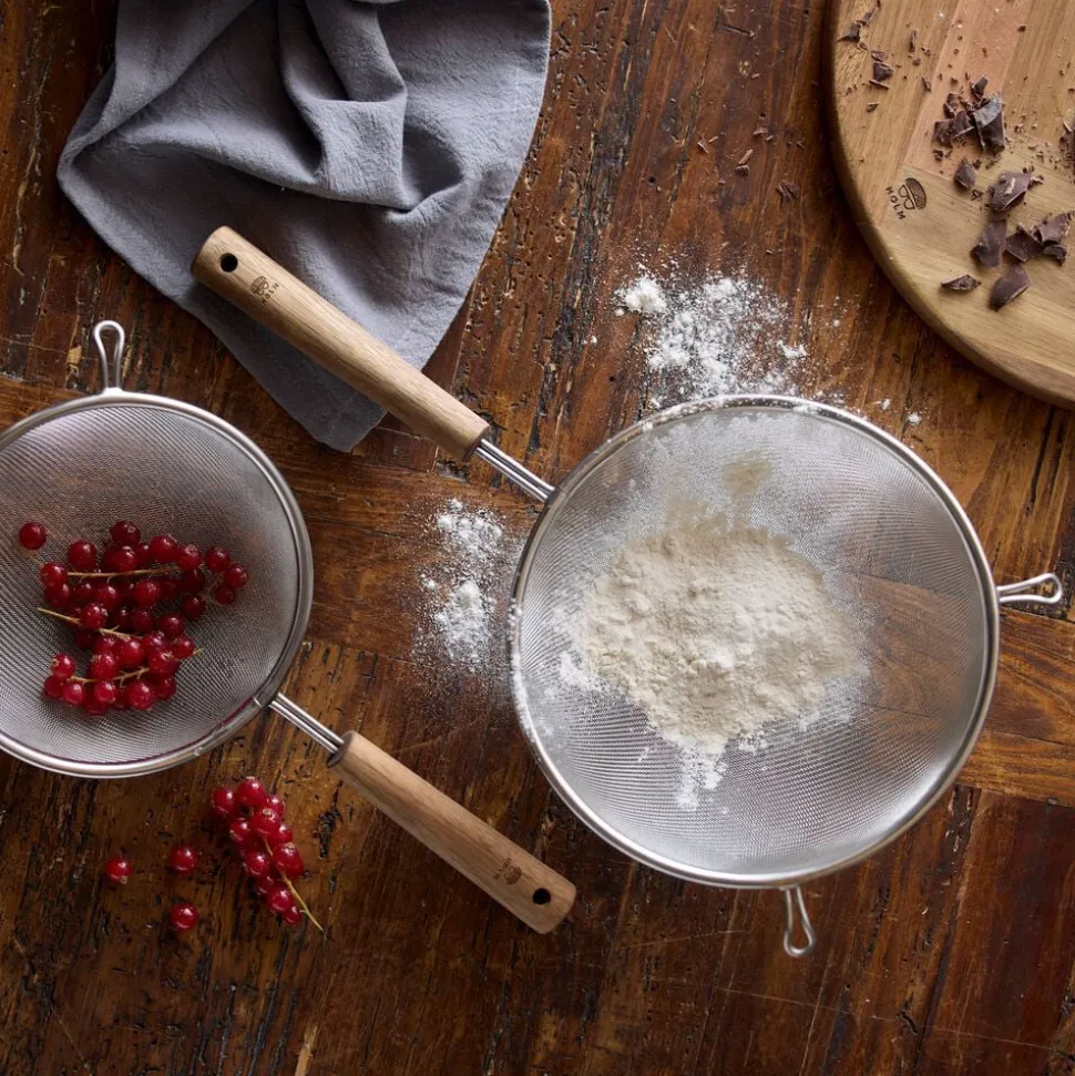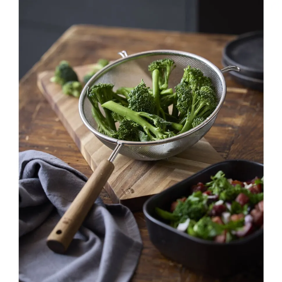 Denne klassiske trådsigte af rustfrit stål med håndtag af smukt akacietræ hører hjemme i ethvert køkken. Det fintmaskede net er perfekt til at sigte mel, sukker, kakao og andre tørre ingredienser, samt til at mose frugt eller bær og sigte supper og sovse. Dia. 20 cm.