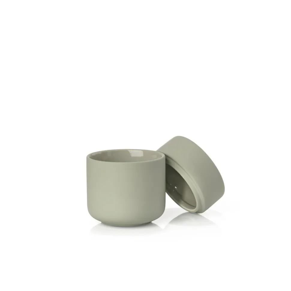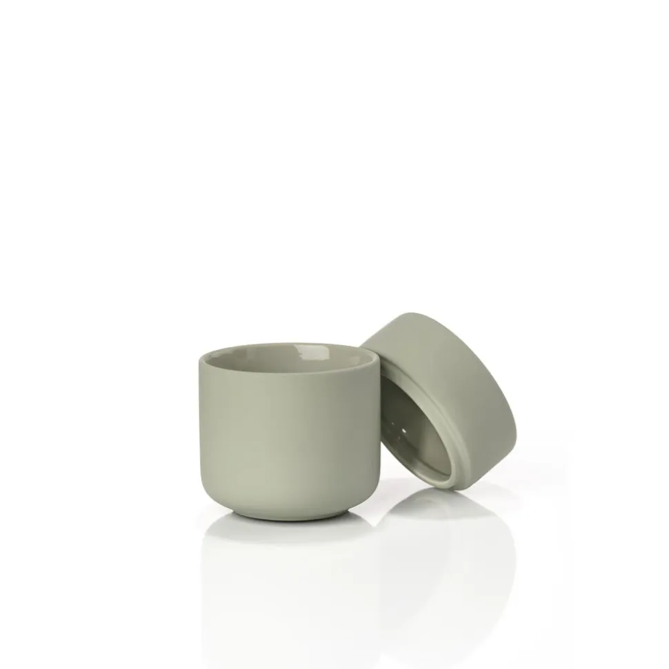 Keramikkrukken med låg har samme enkle, organiske formsprog som resten af den skønne badserie Ume. Den kan rumme dine hårspænder, makeup, vatpinde, vatrondeller eller hvad du ellers har behov for at ha’ ved hånden, men ikke nødvendigvis i syne, på badeværelset.