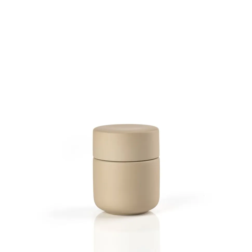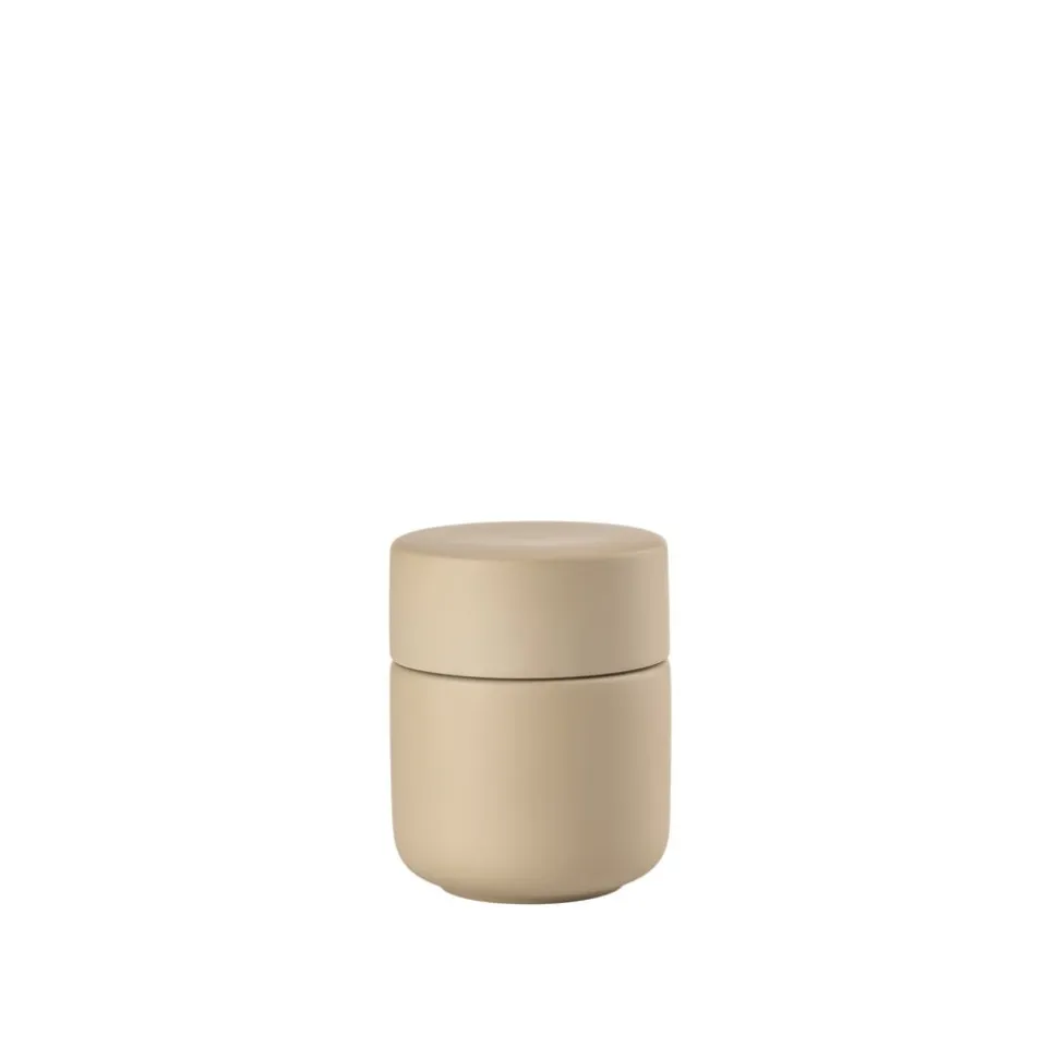 Keramikkrukken med låg har samme enkle, organiske formsprog som resten af den skønne badserie Ume. Den kan rumme dine hårspænder, makeup, vatpinde, vatrondeller eller hvad du ellers har behov for at ha’ ved hånden, men ikke nødvendigvis i syne, på badeværelset.
