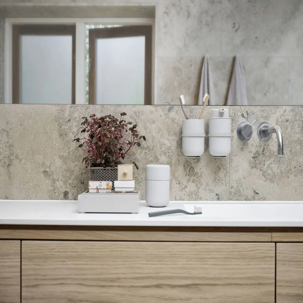 Tandbørstekruset fra badserien Ume fås i de fineste blide farver. Det er i det hele taget et blødt og behageligt bekendtskab, og det er designertrioen VE2, som står bag udformningen af de velproportionerede elementer i serien. Højde 10,3 cm.