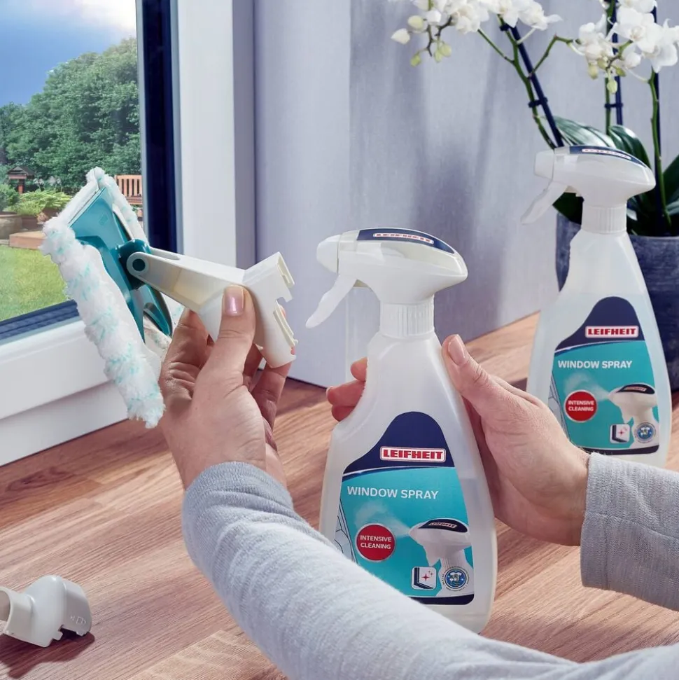 Med Window Spray Cleaner kan du spraye og aftørre vinduer og andre glatte overflader helt uden spand og vand. Aftørringsenheden med coveret sættes direkte på Leifheit vinduessprayflasken og er altid klar til brug. Flasken udskiftes blot, når den er tømt.