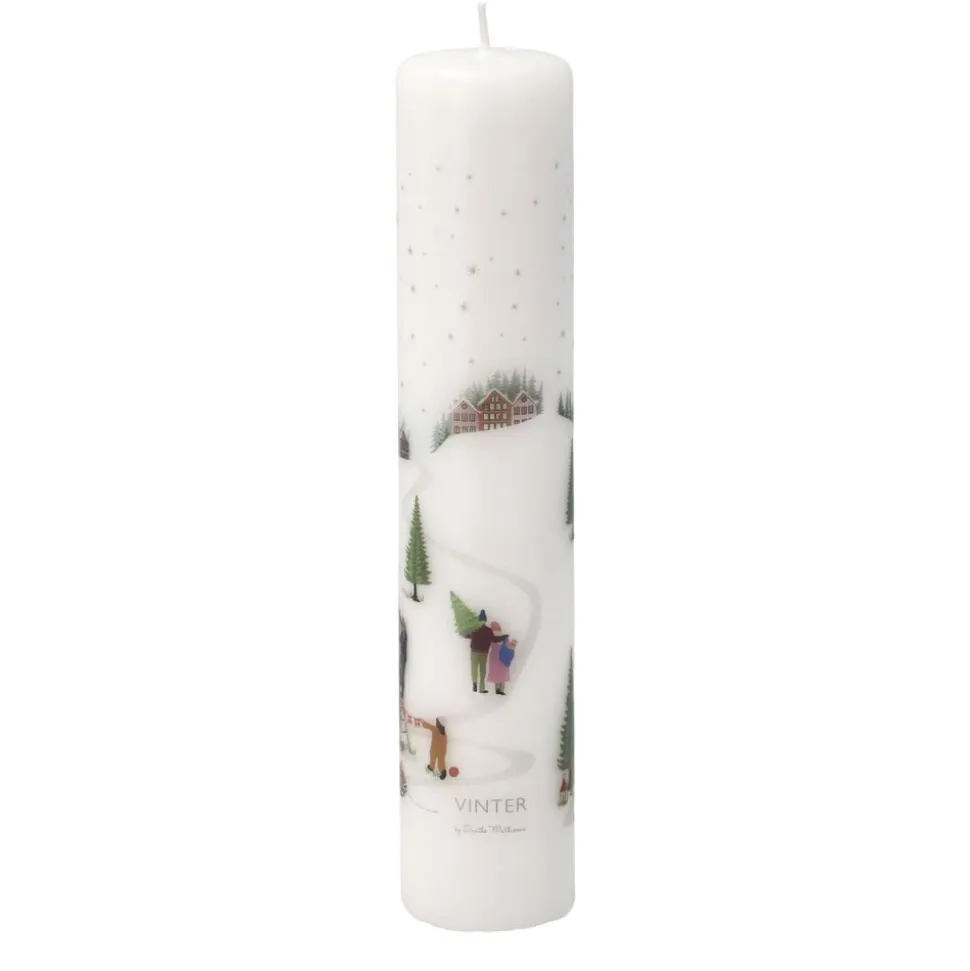 Kalenderlyset er dekoreret med de skønne illustrationer fra serien Vinter, der går igen på kagedåser, viskestykker og Pillivuyts hyggelige stel.