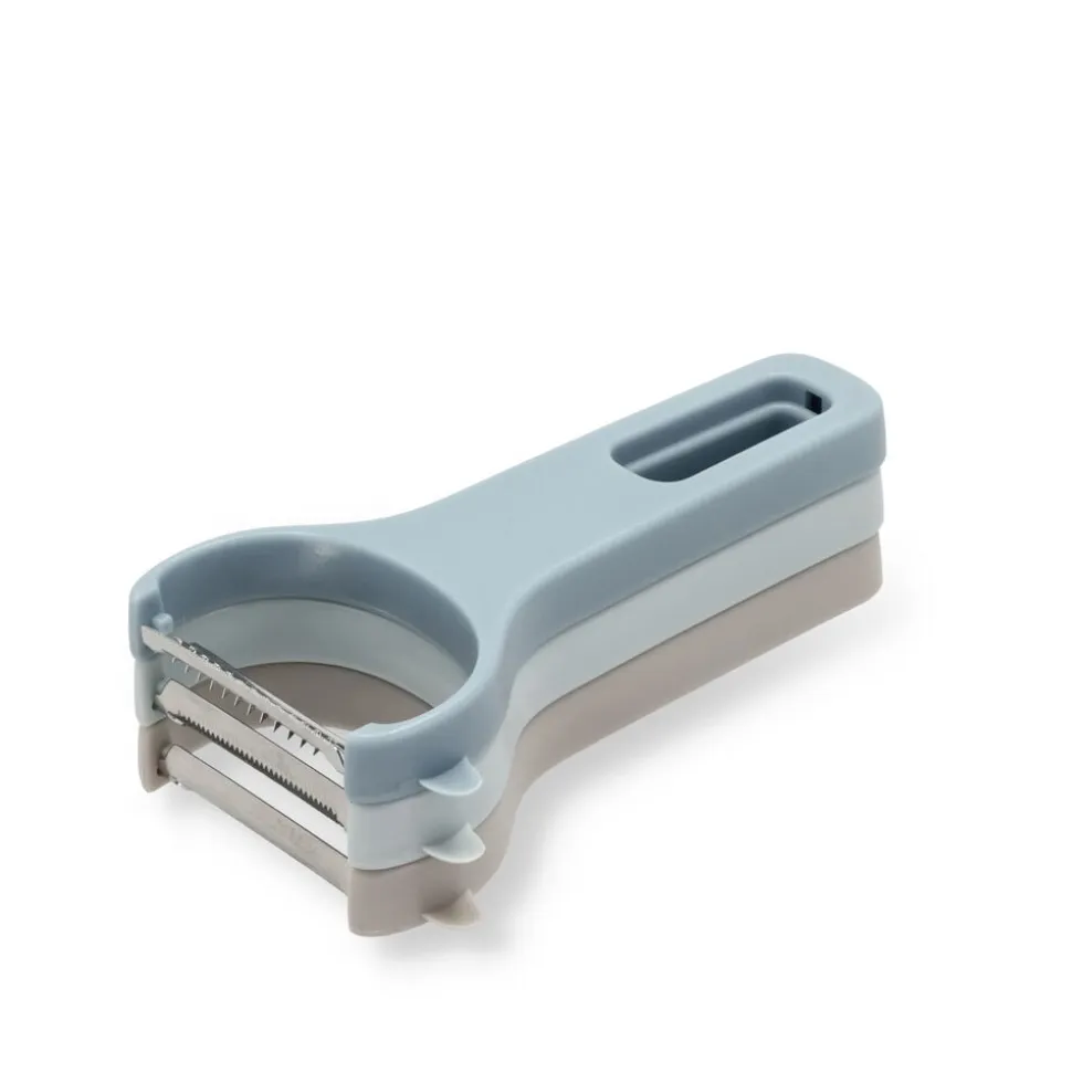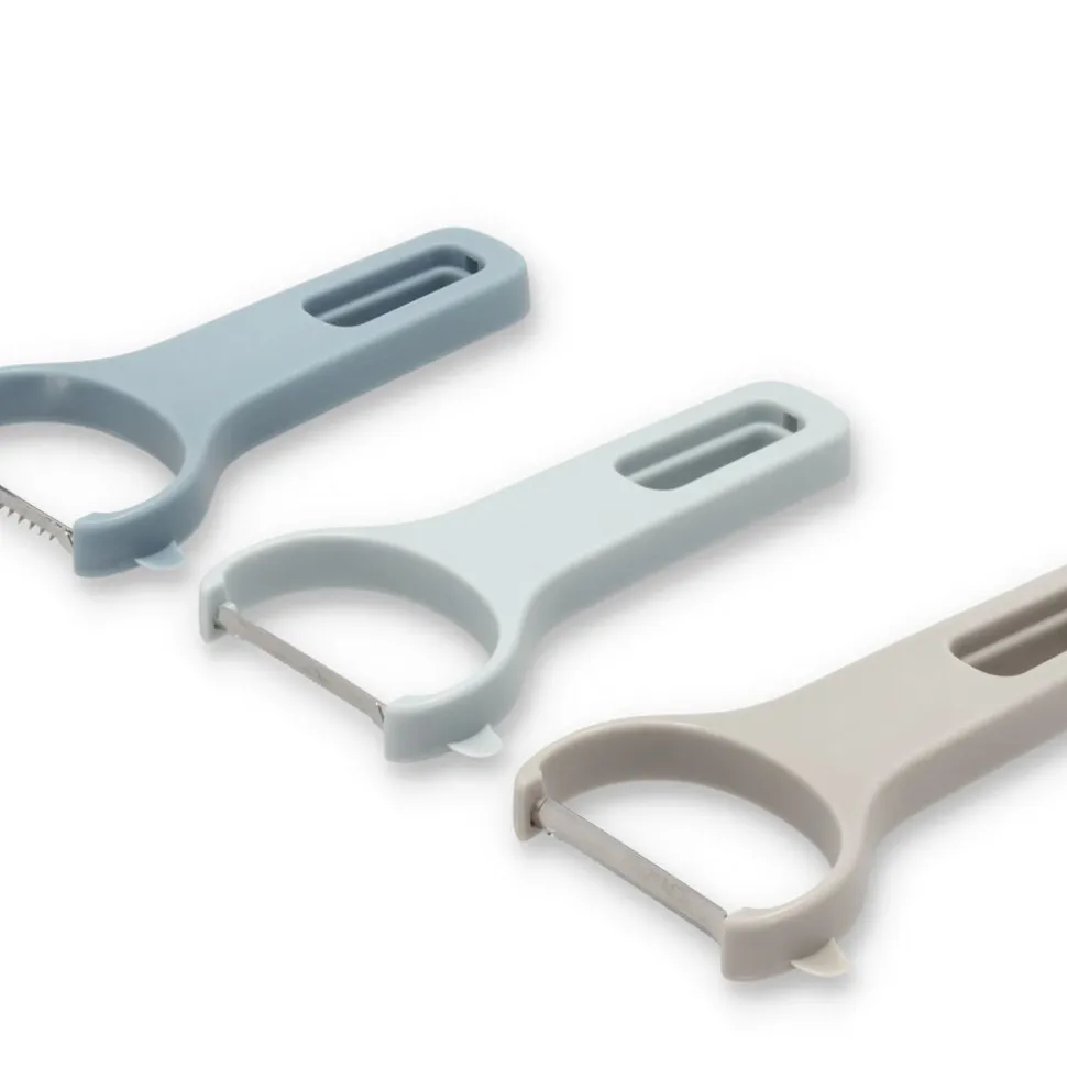 Dette sæt med tre smarte Y-skrællere gør madlavningen lettere og mere praktisk. De tre skrællere har forskellige klinger – en glat klinge til skånsom skrælning af frugt og grøntsager og to med takker i forskellig grovhed, perfekt til eksempelvis dekorative grøntsagsstrimler. Skrællerne kan nemt klikkes sammen, hvilket sparer plads og holder dem samlet i skuffen.