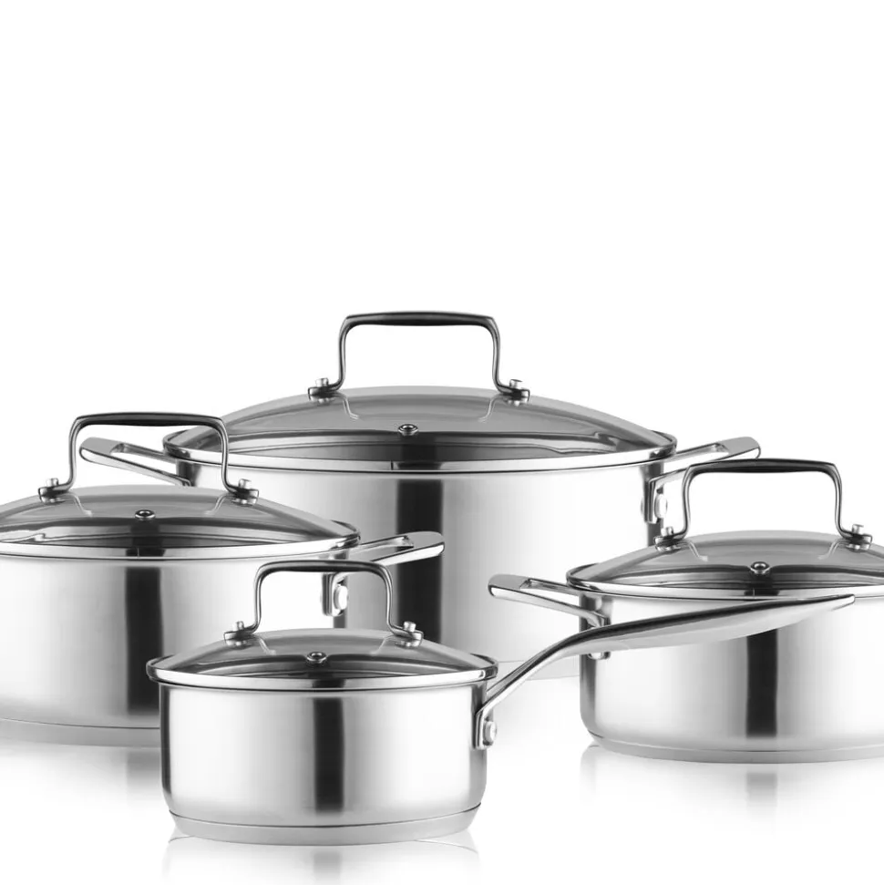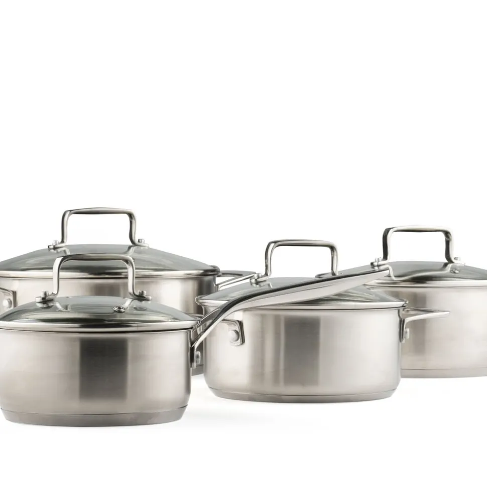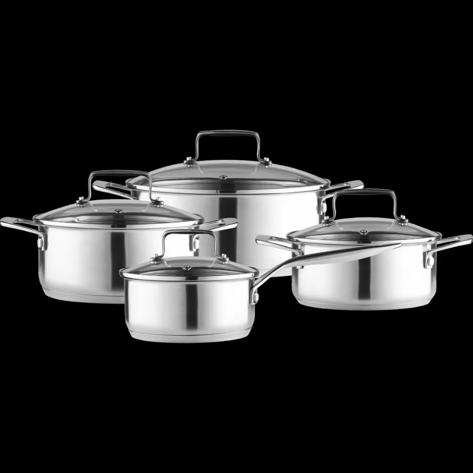 Grydesæt med låg, 8 dele. 79NORD-gryderne er fremstillet i 18/8 rustfrit stål med en bundtykkelse på 4,5 mm og har glaslåg med damphul.