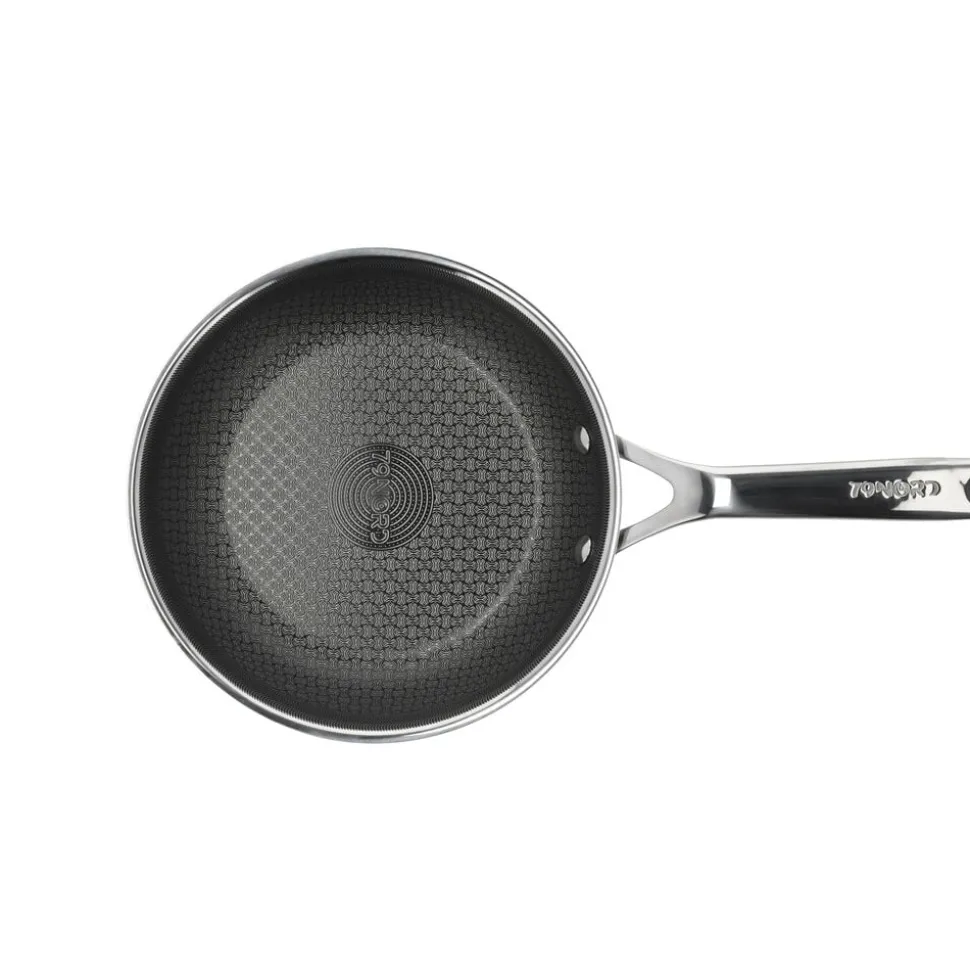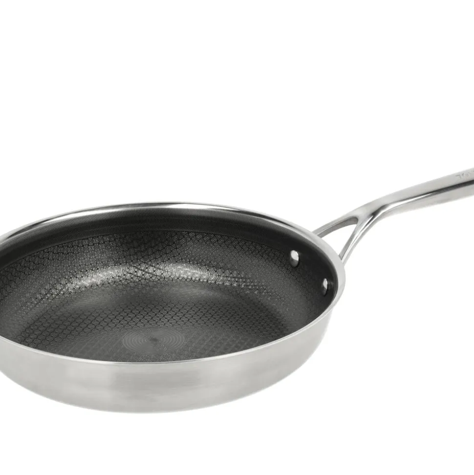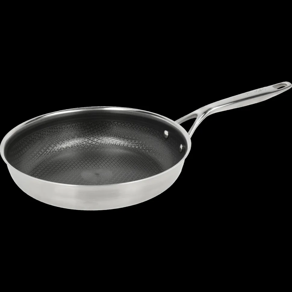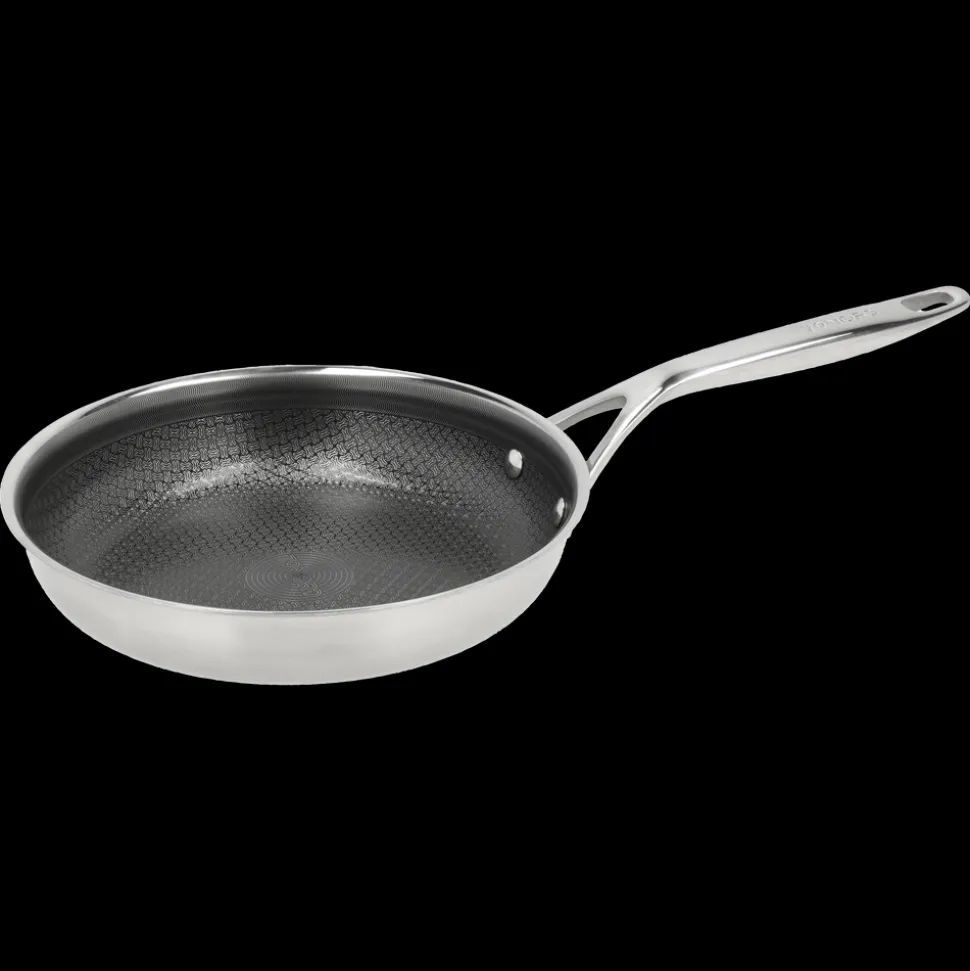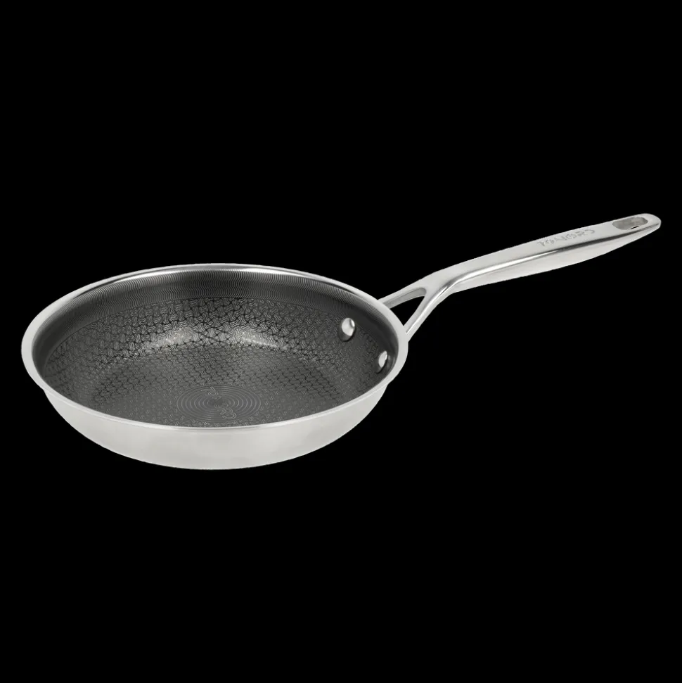 Hybridbelægningen er en kombination af et forhøjet mønster i rustfrit stål og en 2-lags keramisk belægning. Den keramiske belægning er fremstillet af råvarer, der ikke indeholder PFAS. Det forhøjede mønster beskytter belægningen i bunden, og den keramiske topcoating giver non-stick-effekten. Hybridbelægningen er nem at rengøre, og alle typer redskaber kan bruges på belægningen, men vi anbefaler redskaber af træ, plast eller silikone. Inspirationen til mønsteret i hybridbelægningen kommer fra havet omkring øen Mors, fra ringe i vandet, der breder sig hurtigt og ustoppeligt.