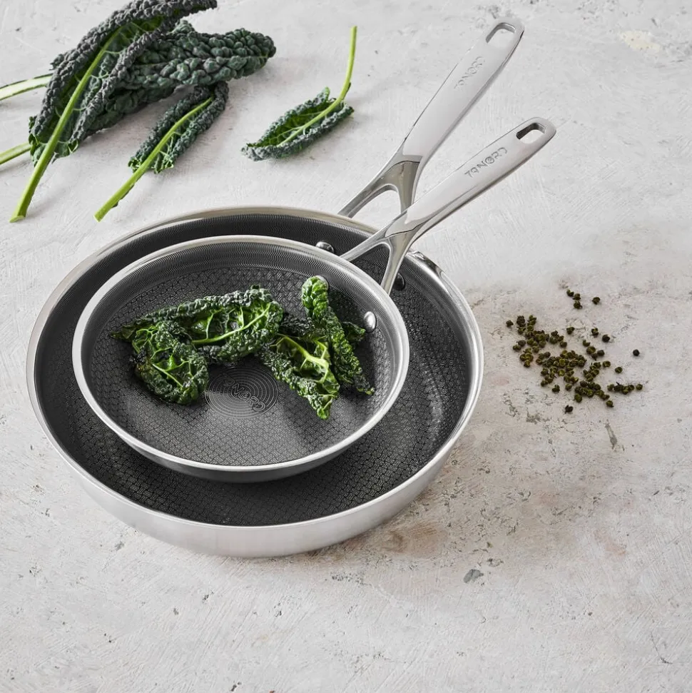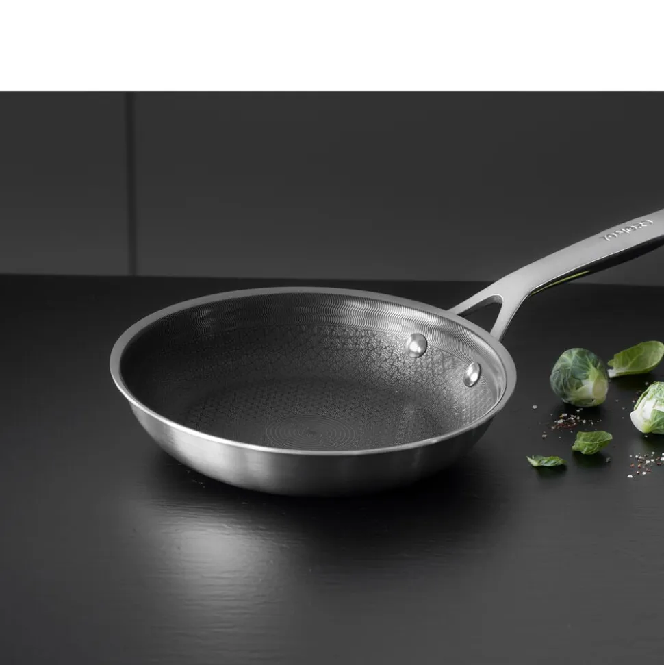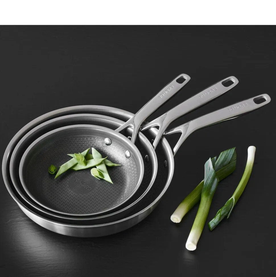 79Nord Hybrid er fremstillet af 3-ply rustfrit stål. Konstruktionen af to lag stål med et aluminiumlag imellem betyder, at varmen fordeles hurtigt og fastholdes jævnt og energieffektivt over både bund og sider, og samtidig er materialet let. Vær forsigtig ved opvarmning – varm gryder og pander langsomt op og undgå at overophede. Udvendigt er gryder og pander satinpolerede, indvendigt har de en innovativ hybridbelægning.