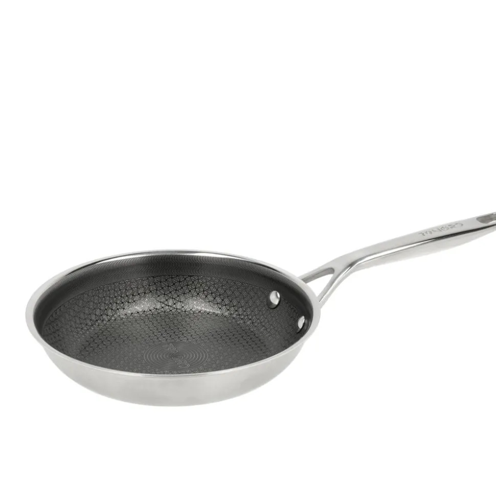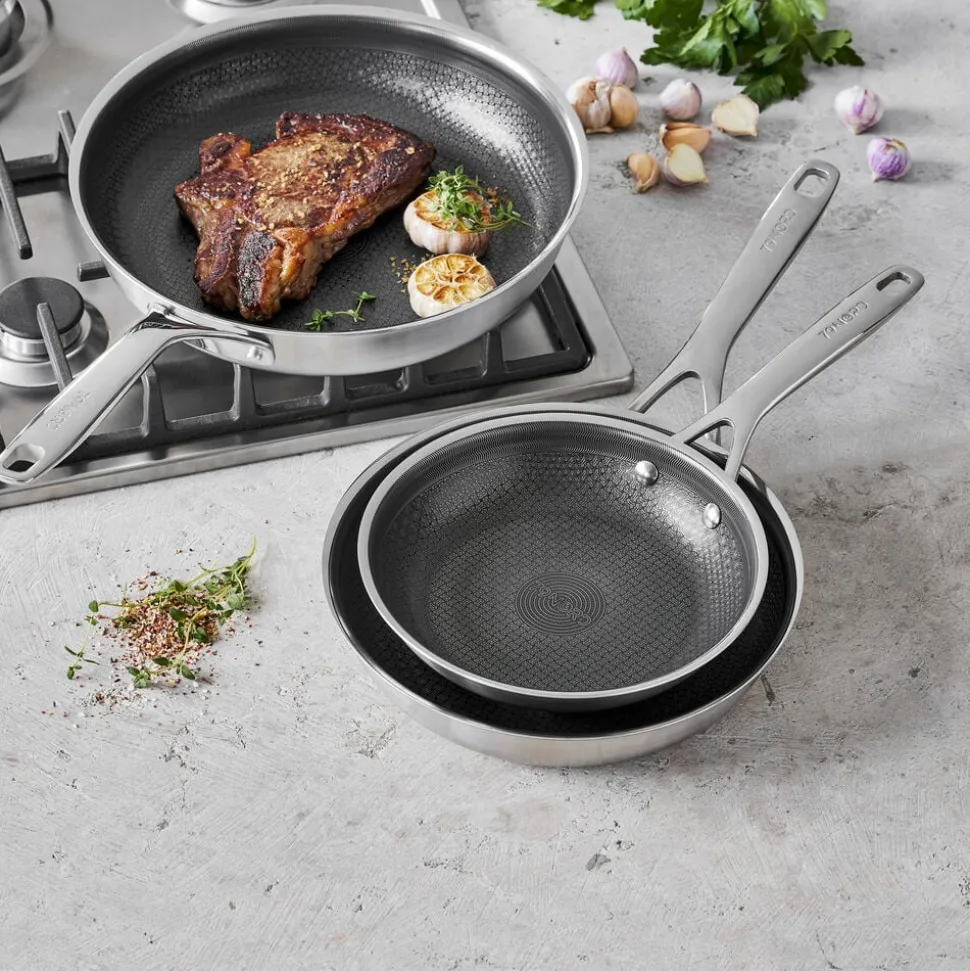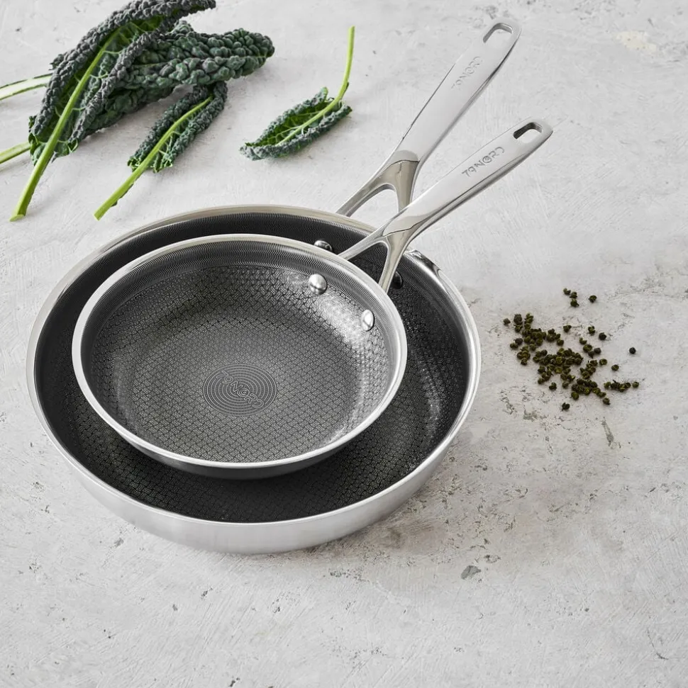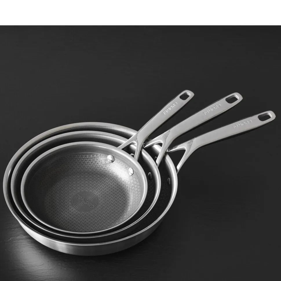 79Nord Hybrid er fremstillet af 3-ply rustfrit stål. Konstruktionen af to lag stål med et aluminiumlag imellem betyder, at varmen fordeles hurtigt og fastholdes jævnt og energieffektivt over både bund og sider, og samtidig er materialet let. Vær forsigtig ved opvarmning – varm gryder og pander langsomt op og undgå at overophede. Udvendigt er gryder og pander satinpolerede, indvendigt har de en innovativ hybridbelægning.