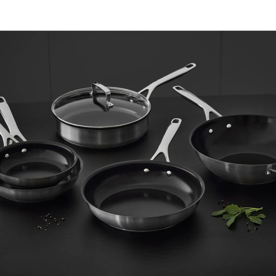 Pandens bund har en aluminiumskerne med et lag af rustfrit stål på begge sider, også kaldet en sandwichbund, hvilket sikrer god varmefordeling. Panden tåler alle køkkenredskaber, men vi anbefaler redskaber af træ, plast og silikone. Opvask i hånden anbefales. Vask i opvaskemaskine vil forkorte den keramiske belægnings levetid.