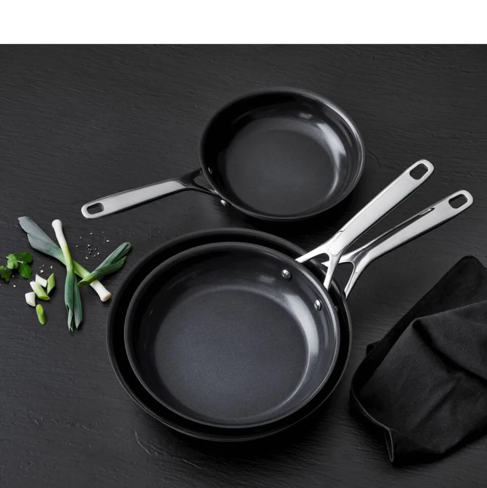 Pandens bund har en aluminiumskerne med et lag af rustfrit stål på begge sider, også kaldet en sandwichbund, hvilket sikrer god varmefordeling. Panden tåler alle køkkenredskaber, men vi anbefaler redskaber af træ, plast og silikone. Opvask i hånden anbefales. Vask i opvaskemaskine vil forkorte den keramiske belægnings levetid.